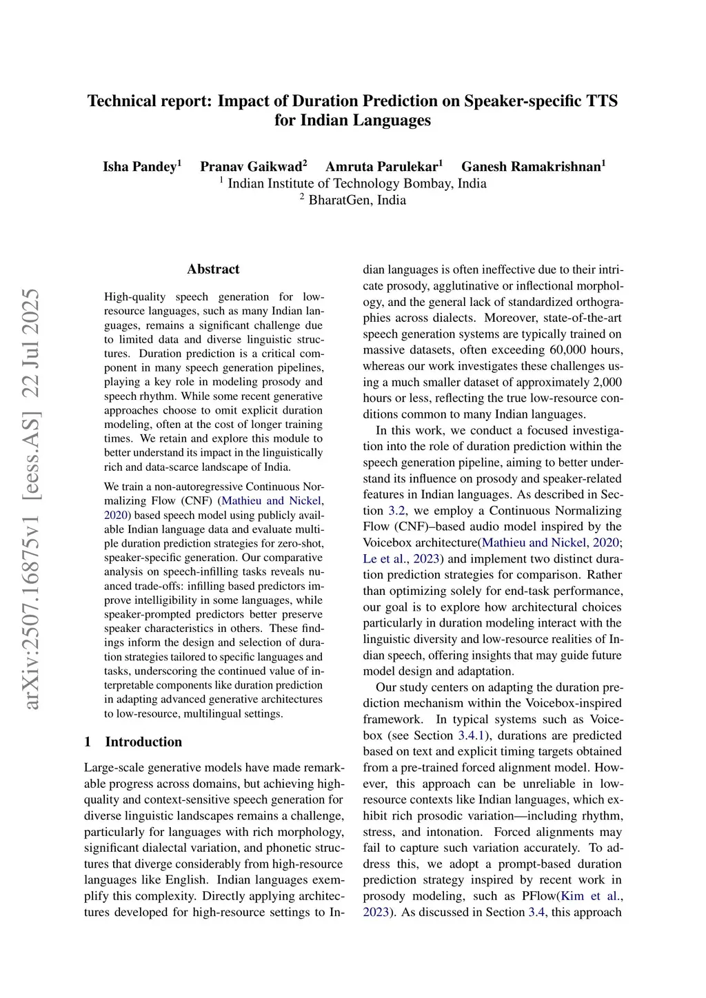 High-quality speech generation for low-resource languages, such as many Indian languages, remains a significant challenge due to limited data and diverse linguistic structures. Duration prediction is a critical component in many speech generation pipelines, playing a key role in modeling prosody and speech rhythm. While some recent generative approaches choose to omit explicit duration modeling, often at the cost of longer training times. We retain and explore this module to better understand its impact in the linguistically rich and data-scarce landscape of India. We train a non-autoregressive Continuous Normalizing Flow (CNF) based speech model using publicly available Indian language data and evaluate multiple duration prediction strategies for zero-shot, speaker-specific generation. Our comparative analysis on speech-infilling tasks reveals nuanced trade-offs: infilling based predictors improve intelligibility in some languages, while speaker-prompted predictors better preserve speaker characteristics in others. These findings inform the design and selection of duration strategies tailored to specific languages and tasks, underscoring the continued value of interpretable components like duration prediction in adapting advanced generative architectures to low-resource, multilingual settings.