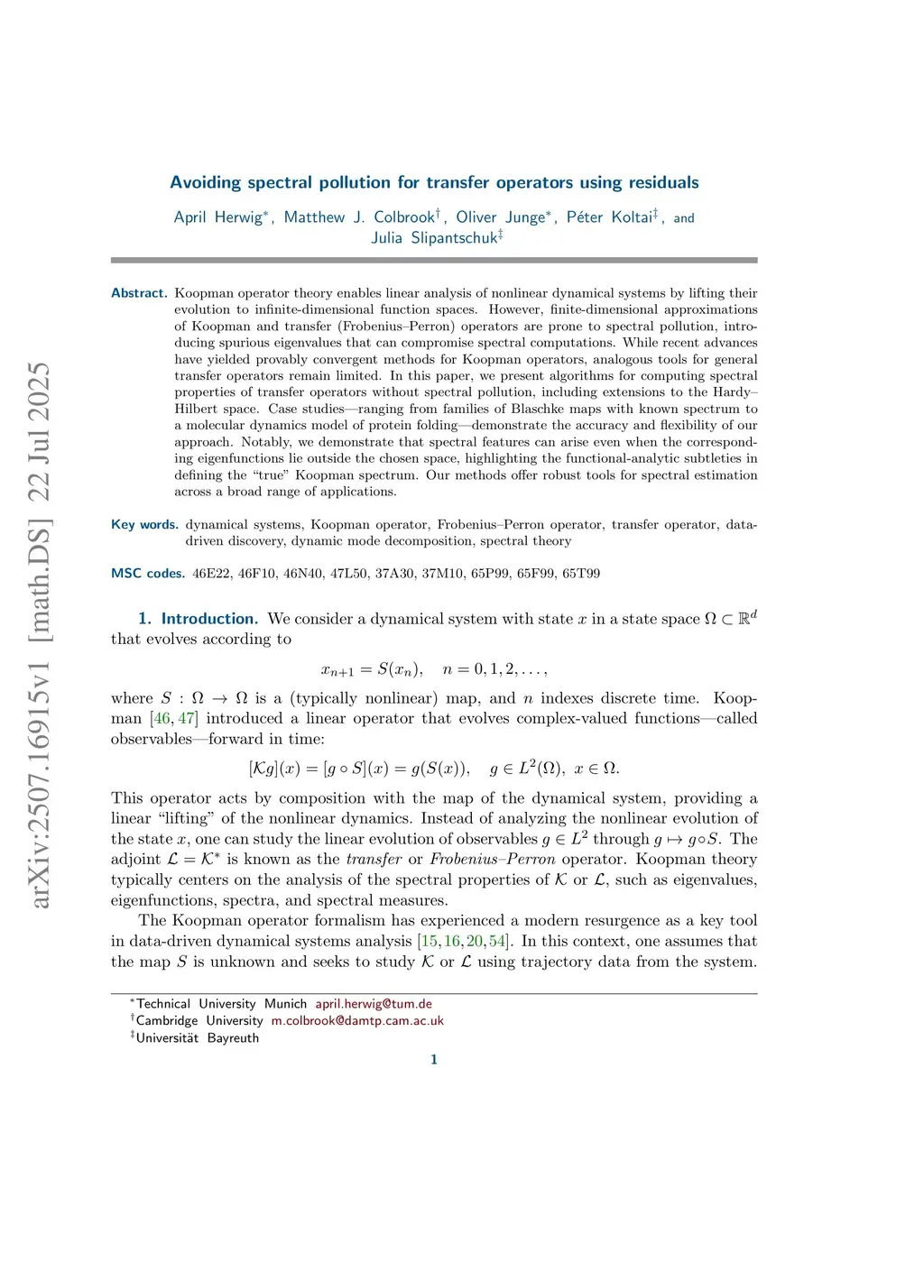Koopman operator theory enables linear analysis of nonlinear dynamical systems by lifting their evolution to infinite-dimensional function spaces. However, finite-dimensional approximations of Koopman and transfer (Frobenius--Perron) operators are prone to spectral pollution, introducing spurious eigenvalues that can compromise spectral computations. While recent advances have yielded provably convergent methods for Koopman operators, analogous tools for general transfer operators remain limited. In this paper, we present algorithms for computing spectral properties of transfer operators without spectral pollution, including extensions to the Hardy-Hilbert space. Case studies--ranging from families of Blaschke maps with known spectrum to a molecular dynamics model of protein folding--demonstrate the accuracy and flexibility of our approach. Notably, we demonstrate that spectral features can arise even when the corresponding eigenfunctions lie outside the chosen space, highlighting the functional-analytic subtleties in defining the "true" Koopman spectrum. Our methods offer robust tools for spectral estimation across a broad range of applications.