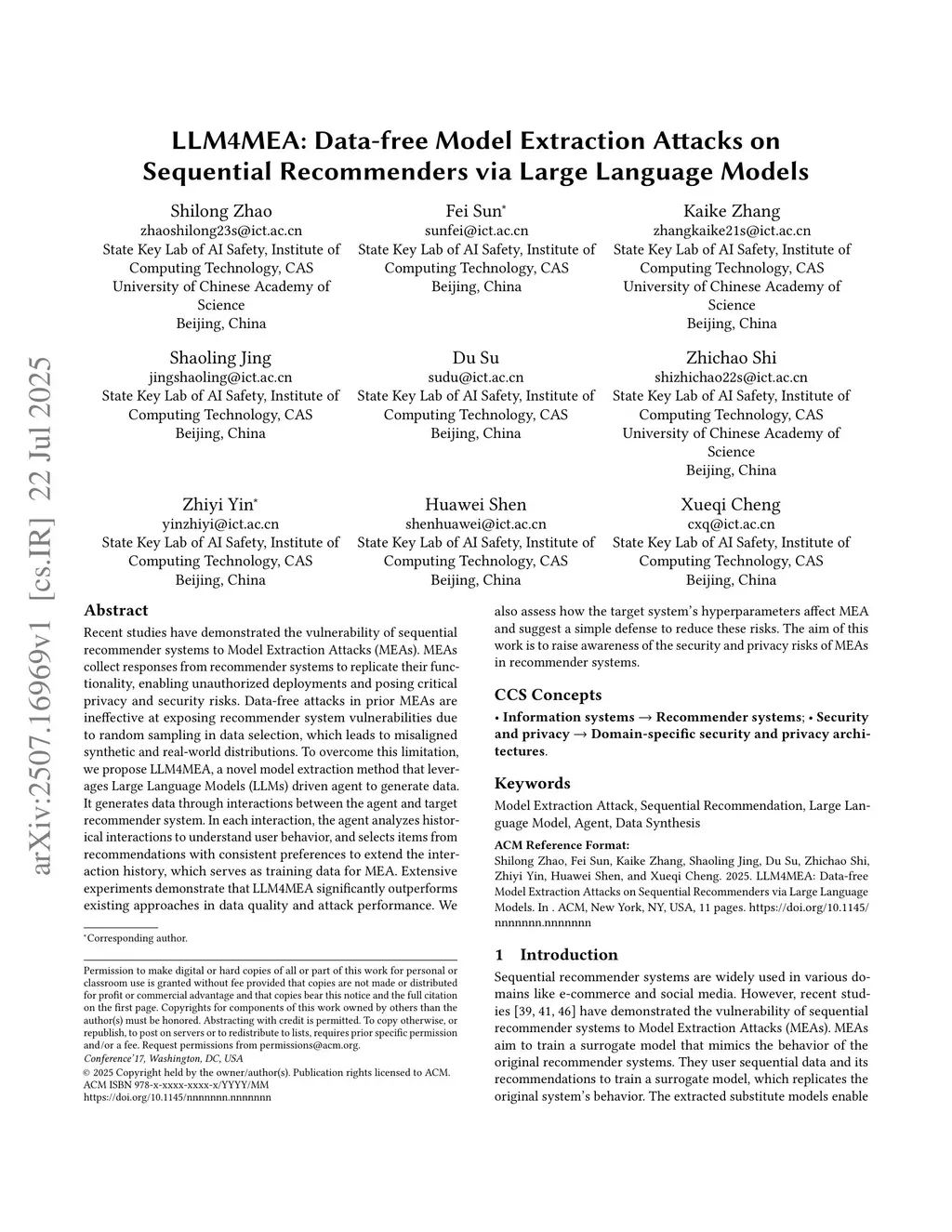 Recent studies have demonstrated the vulnerability of sequential recommender systems to Model Extraction Attacks (MEAs). MEAs collect responses from recommender systems to replicate their functionality, enabling unauthorized deployments and posing critical privacy and security risks. Black-box attacks in prior MEAs are ineffective at exposing recommender system vulnerabilities due to random sampling in data selection, which leads to misaligned synthetic and real-world distributions. To overcome this limitation, we propose LLM4MEA, a novel model extraction method that leverages Large Language Models (LLMs) as human-like rankers to generate data. It generates data through interactions between the LLM ranker and target recommender system. In each interaction, the LLM ranker analyzes historical interactions to understand user behavior, and selects items from recommendations with consistent preferences to extend the interaction history, which serves as training data for MEA. Extensive experiments demonstrate that LLM4MEA significantly outperforms existing approaches in data quality and attack performance, reducing the divergence between synthetic and real-world data by up to 64.98% and improving MEA performance by 44.82% on average. From a defensive perspective, we propose a simple yet effective defense strategy and identify key hyperparameters of recommender systems that can mitigate the risk of MEAs.