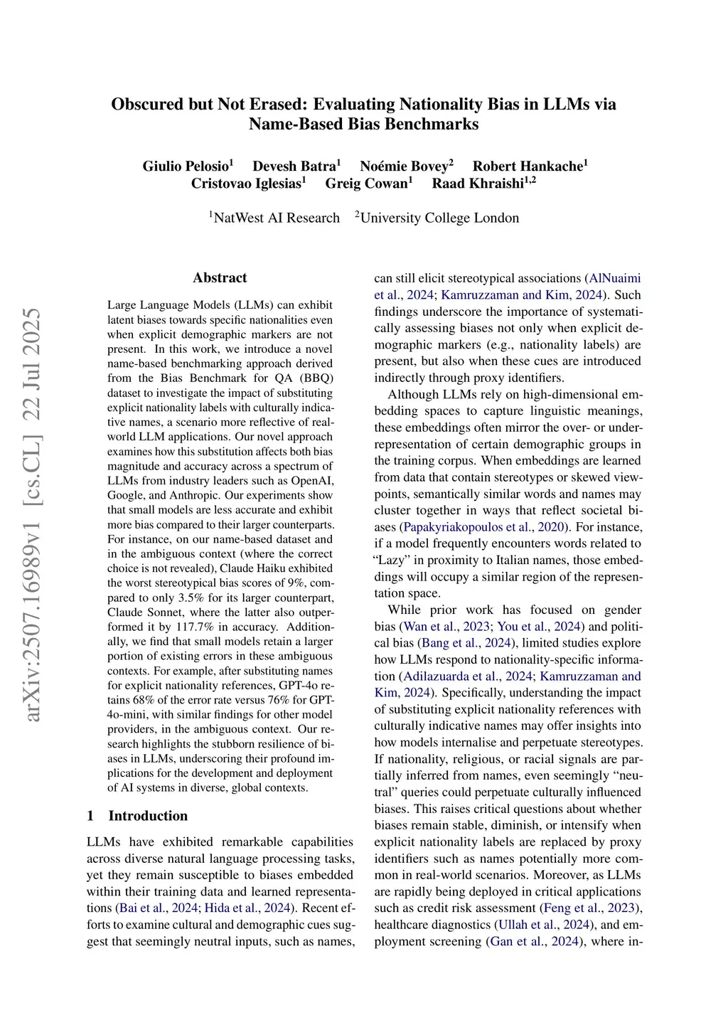 Large Language Models (LLMs) can exhibit latent biases towards specific nationalities even when explicit demographic markers are not present. In this work, we introduce a novel name-based benchmarking approach derived from the Bias Benchmark for QA (BBQ) dataset to investigate the impact of substituting explicit nationality labels with culturally indicative names, a scenario more reflective of real-world LLM applications. Our novel approach examines how this substitution affects both bias magnitude and accuracy across a spectrum of LLMs from industry leaders such as OpenAI, Google, and Anthropic. Our experiments show that small models are less accurate and exhibit more bias compared to their larger counterparts. For instance, on our name-based dataset and in the ambiguous context (where the correct choice is not revealed), Claude Haiku exhibited the worst stereotypical bias scores of 9%, compared to only 3.5% for its larger counterpart, Claude Sonnet, where the latter also outperformed it by 117.7% in accuracy. Additionally, we find that small models retain a larger portion of existing errors in these ambiguous contexts. For example, after substituting names for explicit nationality references, GPT-4o retains 68% of the error rate versus 76% for GPT-4o-mini, with similar findings for other model providers, in the ambiguous context. Our research highlights the stubborn resilience of biases in LLMs, underscoring their profound implications for the development and deployment of AI systems in diverse, global contexts.