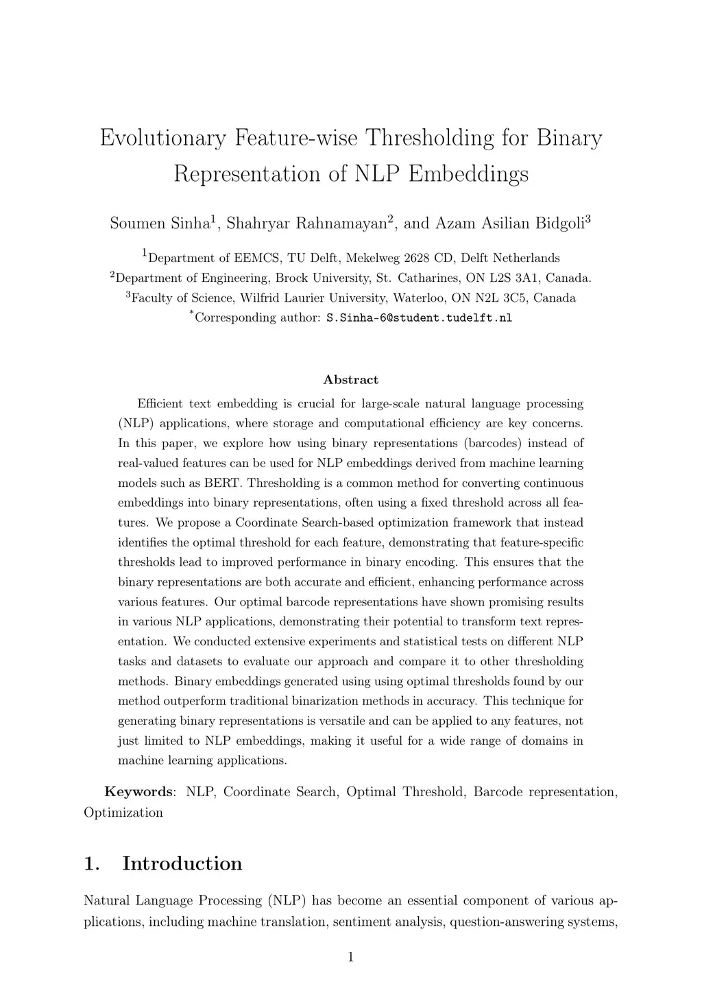 Evolutionary Feature-wise Thresholding for Binary Representation of NLP Embeddings
