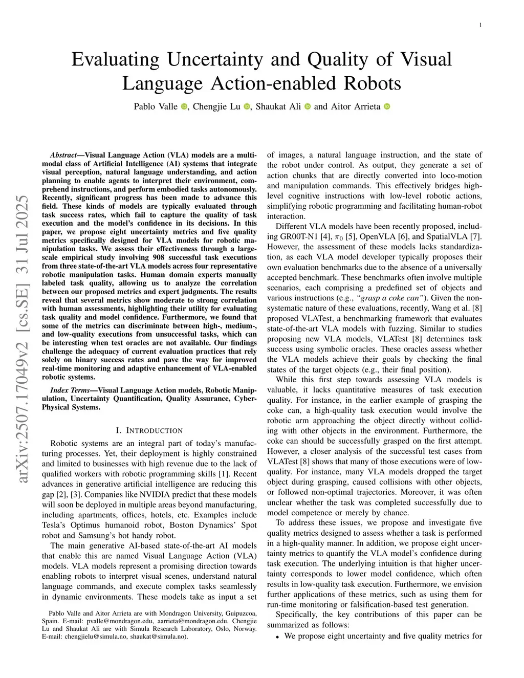 Evaluating Uncertainty and Quality of Visual Language Action-enabled Robots