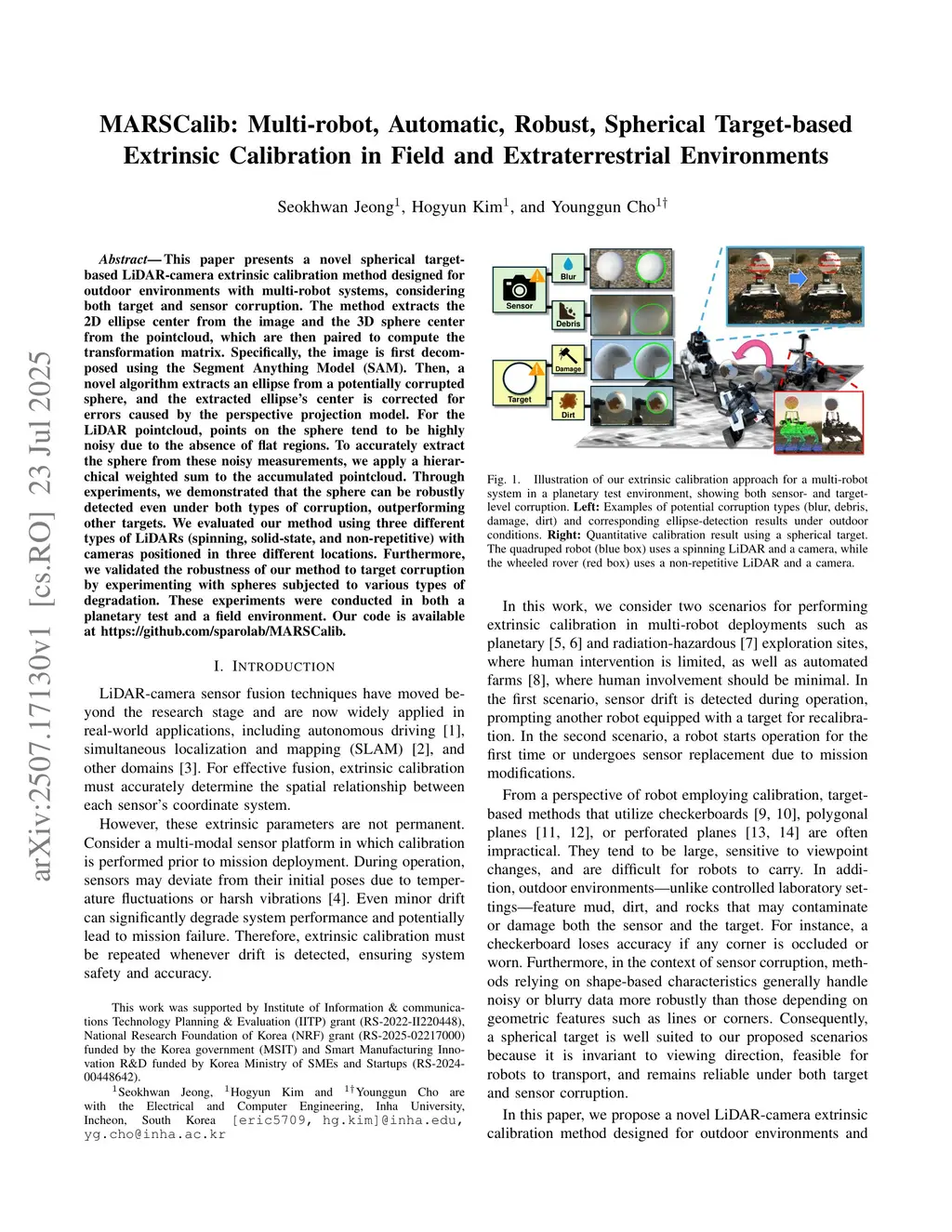 This paper presents a novel spherical target-based LiDAR-camera extrinsic calibration method designed for outdoor environments with multi-robot systems, considering both target and sensor corruption. The method extracts the 2D ellipse center from the image and the 3D sphere center from the pointcloud, which are then paired to compute the transformation matrix. Specifically, the image is first decomposed using the Segment Anything Model (SAM). Then, a novel algorithm extracts an ellipse from a potentially corrupted sphere, and the extracted center of ellipse is corrected for errors caused by the perspective projection model. For the LiDAR pointcloud, points on the sphere tend to be highly noisy due to the absence of flat regions. To accurately extract the sphere from these noisy measurements, we apply a hierarchical weighted sum to the accumulated pointcloud. Through experiments, we demonstrated that the sphere can be robustly detected even under both types of corruption, outperforming other targets. We evaluated our method using three different types of LiDARs (spinning, solid-state, and non-repetitive) with cameras positioned in three different locations. Furthermore, we validated the robustness of our method to target corruption by experimenting with spheres subjected to various types of degradation. These experiments were conducted in both a planetary test and a field environment. Our code is available atthis https URL.