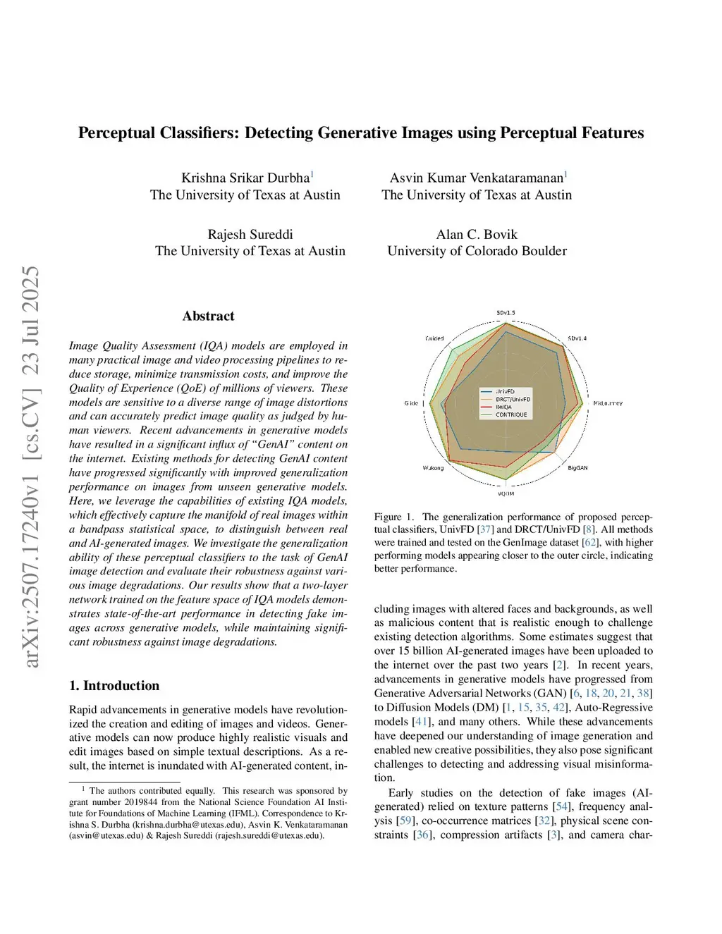 Image Quality Assessment (IQA) models are employed in many practical image and video processing pipelines to reduce storage, minimize transmission costs, and improve the Quality of Experience (QoE) of millions of viewers. These models are sensitive to a diverse range of image distortions and can accurately predict image quality as judged by human viewers. Recent advancements in generative models have resulted in a significant influx of "GenAI" content on the internet. Existing methods for detecting GenAI content have progressed significantly with improved generalization performance on images from unseen generative models. Here, we leverage the capabilities of existing IQA models, which effectively capture the manifold of real images within a bandpass statistical space, to distinguish between real and AI-generated images. We investigate the generalization ability of these perceptual classifiers to the task of GenAI image detection and evaluate their robustness against various image degradations. Our results show that a two-layer network trained on the feature space of IQA models demonstrates state-of-the-art performance in detecting fake images across generative models, while maintaining significant robustness against image degradations.