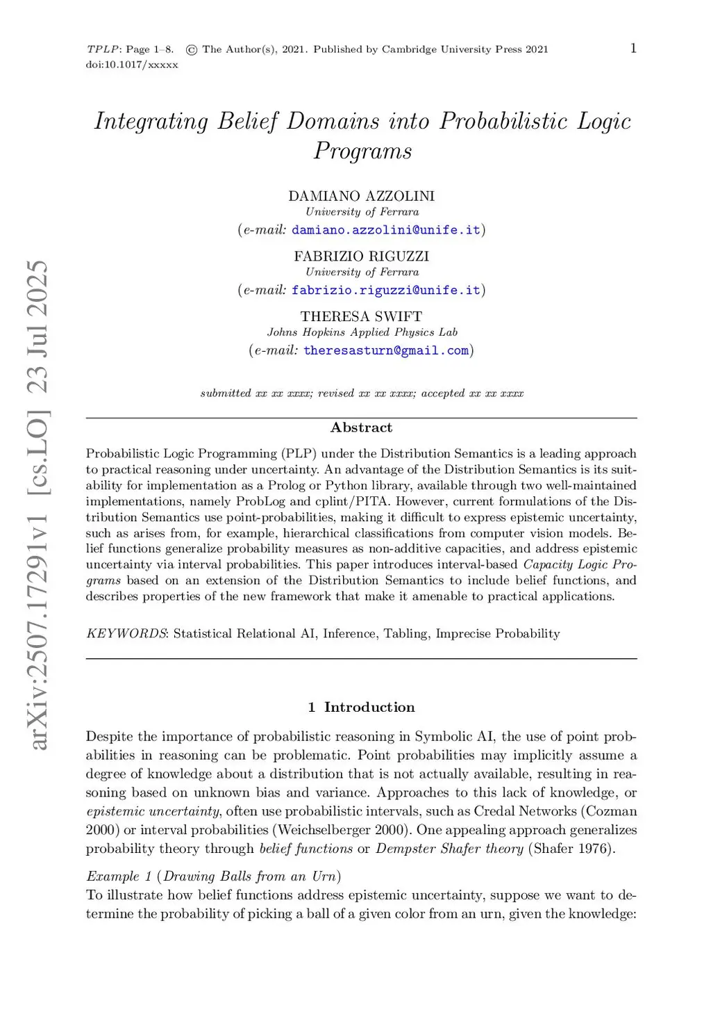 Probabilistic Logic Programming (PLP) under the Distribution Semantics is a leading approach to practical reasoning under uncertainty. An advantage of the Distribution Semantics is its suitability for implementation as a Prolog or Python library, available through two well-maintained implementations, namely ProbLog and cplint/PITA. However, current formulations of the Distribution Semantics use point-probabilities, making it difficult to express epistemic uncertainty, such as arises from, for example, hierarchical classifications from computer vision models. Belief functions generalize probability measures as non-additive capacities, and address epistemic uncertainty via interval probabilities. This paper introduces interval-based Capacity Logic Programs based on an extension of the Distribution Semantics to include belief functions, and describes properties of the new framework that make it amenable to practical applications.