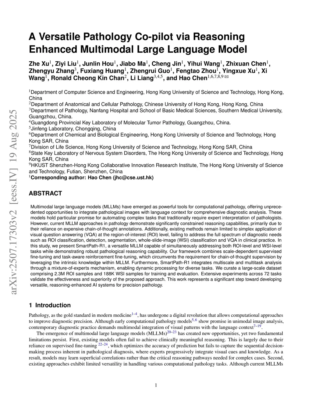 Multimodal large language models (MLLMs) have emerged as powerful tools for computational pathology, offering unprecedented opportunities to integrate pathological images with language context for comprehensive diagnostic analysis. These models hold particular promise for automating complex tasks that traditionally require expert interpretation of pathologists. However, current MLLM approaches in pathology demonstrate significantly constrained reasoning capabilities, primarily due to their reliance on expensive chain-of-thought annotations. Additionally, existing methods remain limited to simplex application of visual question answering (VQA) at the region-of-interest (ROI) level, failing to address the full spectrum of diagnostic needs such as ROI classification, detection, segmentation, whole-slide-image (WSI) classification and VQA in clinical practice. In this study, we present SmartPath-R1, a versatile MLLM capable of simultaneously addressing both ROI-level and WSI-level tasks while demonstrating robust pathological reasoning capability. Our framework combines scale-dependent supervised fine-tuning and task-aware reinforcement fine-tuning, which circumvents the requirement for chain-of-thought supervision by leveraging the intrinsic knowledge within MLLM. Furthermore, SmartPath-R1 integrates multiscale and multitask analysis through a mixture-of-experts mechanism, enabling dynamic processing for diverse tasks. We curate a large-scale dataset comprising 2.3M ROI samples and 188K WSI samples for training and evaluation. Extensive experiments across 72 tasks validate the effectiveness and superiority of the proposed approach. This work represents a significant step toward developing versatile, reasoning-enhanced AI systems for precision pathology.