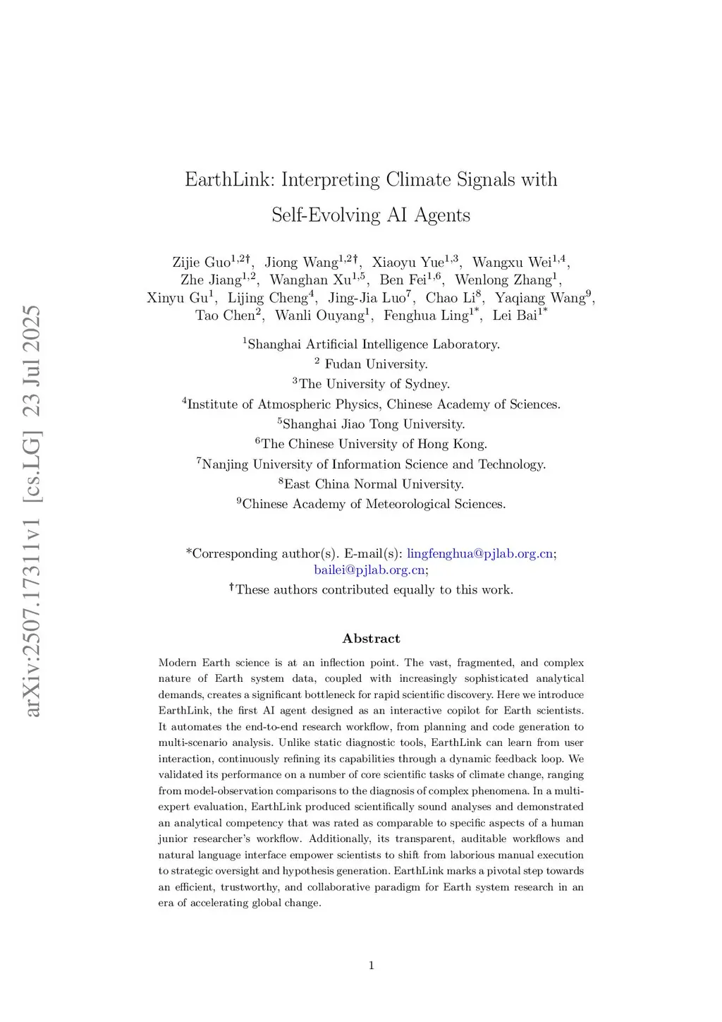 Scientific progress in Earth science depends on integrating data across the planet's interconnected spheres. However, the accelerating volume and fragmentation of multi-sphere knowledge and data have surpassed human analytical capacity. This creates a major bottleneck for discovery, especially in climate science. To address this challenge, we introduce EarthLink, the first self-evolving AI agent system designed as an interactive "copilot" for Earth scientists. Through natural language interaction, EarthLink automates the entire research workflow by integrating planning, code execution, data analysis, and physical reasoning into a unified process that directly addresses this limitation. Beyond efficiency, it exhibits human-like cross-disciplinary analytical ability and achieves proficiency comparable to a junior researcher in expert evaluations on core large-scale climate tasks, including model-observation comparison and climate change understanding. When tasked with an open scientific problem, specifically the discovery of precursors of the Atlantic Niño, EarthLink autonomously developed a research strategy, identified sources of predictability, verified its hypotheses with available data, and proposed a physically consistent mechanism. These emerging capabilities enable a new human-AI research paradigm. Scientists can focus on value and result judgments, while AI systems handle complex data analysis and knowledge integration. This accelerates the pace and breadth of discovery in Earth sciences. The system is accessible at our websitethis https URL.