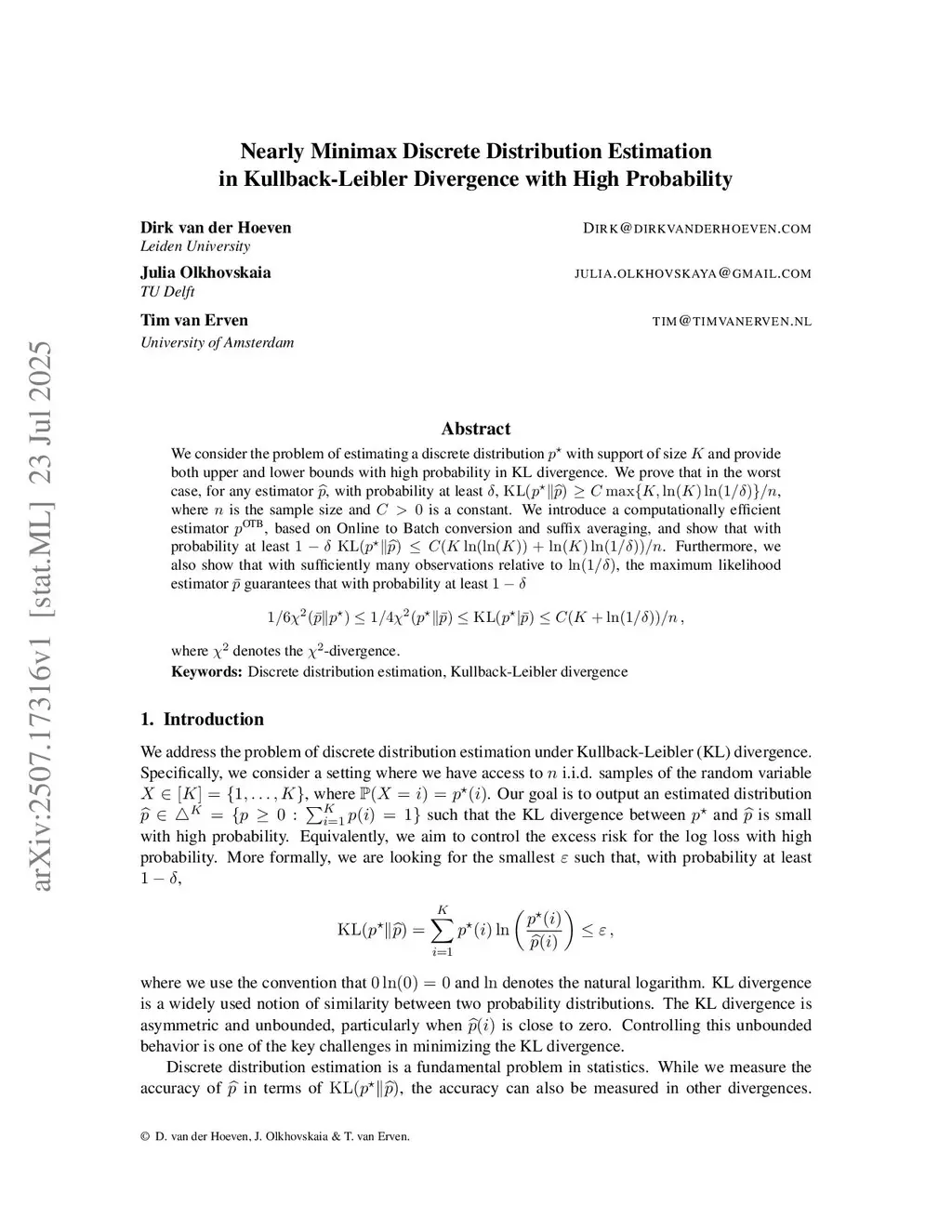 We consider the fundamental problem of estimating a discrete distribution on a domain of size with high probability in Kullback-Leibler divergence. We provide upper and lower bounds on the minimax estimation rate, which show that the optimal rate is between and at error probability and sample size , which pins down the rate up to the doubly logarithmic factor that multiplies . Our upper bound uses techniques from online learning to construct a novel estimator via online-to-batch conversion. Perhaps surprisingly, the tail behavior of the minimax rate is worse than for the squared total variation and squared Hellinger distance, for which it is , i.e. without the multiplying . As a consequence, we cannot obtain a fully tight lower bound from the usual reduction to these smaller distances. Moreover, we show that this lower bound cannot be achieved by the standard lower bound approach based on a reduction to hypothesis testing, and instead we need to introduce a new reduction to what we call weak hypothesis testing. We investigate the source of the gap with other divergences further in refined results, which show that the total variation rate is achievable for Kullback-Leibler divergence after all (in fact by he maximum likelihood estimator) if we rule out outcome probabilities smaller than , which is a vanishing set as increases for fixed and . This explains why minimax Kullback-Leibler estimation is more difficult than asymptotic estimation.