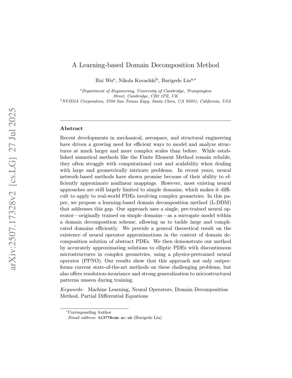 Recent developments in mechanical, aerospace, and structural engineering have driven a growing need for efficient ways to model and analyse structures at much larger and more complex scales than before. While established numerical methods like the Finite Element Method remain reliable, they often struggle with computational cost and scalability when dealing with large and geometrically intricate problems. In recent years, neural network-based methods have shown promise because of their ability to efficiently approximate nonlinear mappings. However, most existing neural approaches are still largely limited to simple domains, which makes it difficult to apply to real-world PDEs involving complex geometries. In this paper, we propose a learning-based domain decomposition method (L-DDM) that addresses this gap. Our approach uses a single, pre-trained neural operator-originally trained on simple domains-as a surrogate model within a domain decomposition scheme, allowing us to tackle large and complicated domains efficiently. We provide a general theoretical result on the existence of neural operator approximations in the context of domain decomposition solution of abstract PDEs. We then demonstrate our method by accurately approximating solutions to elliptic PDEs with discontinuous microstructures in complex geometries, using a physics-pretrained neural operator (PPNO). Our results show that this approach not only outperforms current state-of-the-art methods on these challenging problems, but also offers resolution-invariance and strong generalization to microstructural patterns unseen during training.