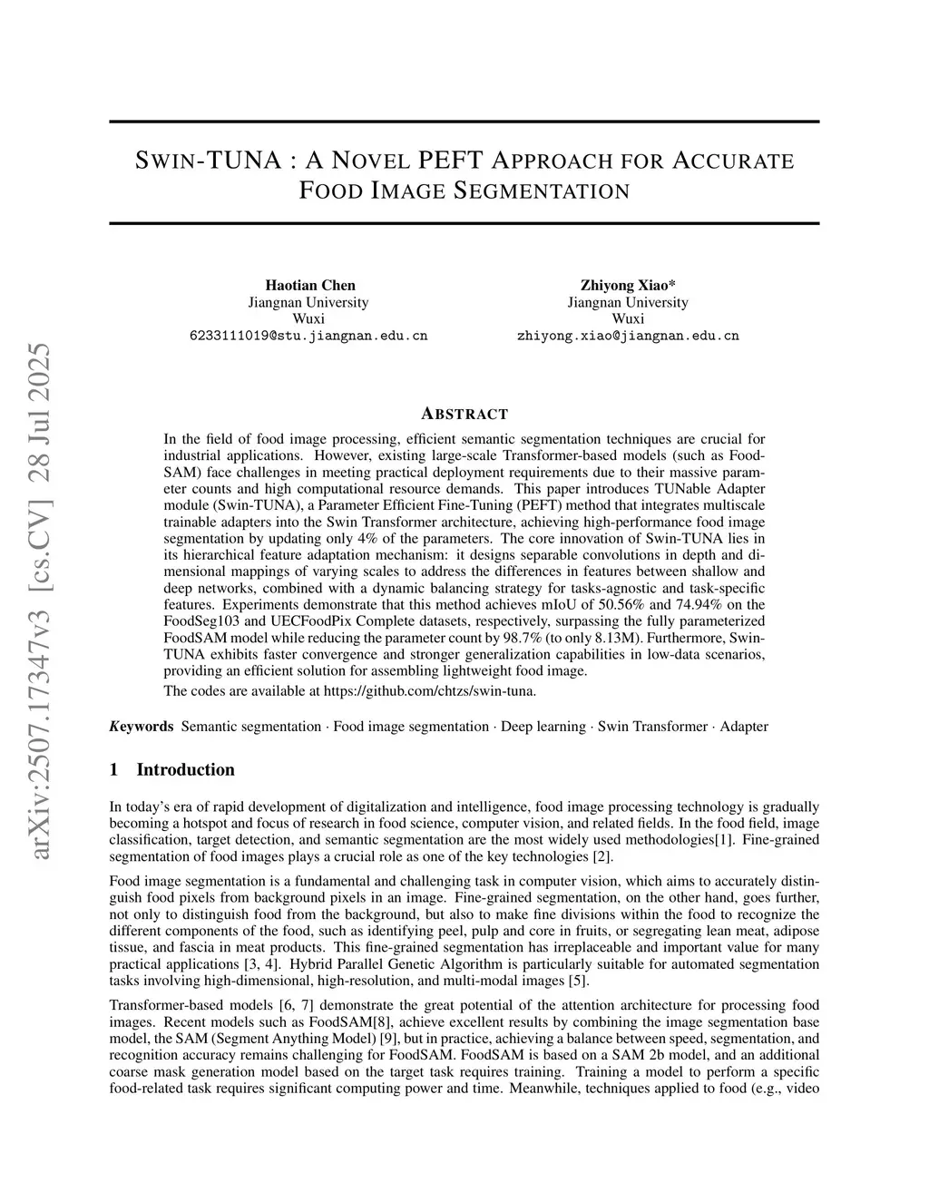 In the field of food image processing, efficient semantic segmentation techniques are crucial for industrial applications. However, existing large-scale Transformer-based models (such as FoodSAM) face challenges in meeting practical deploymentrequirements due to their massive parameter counts and high computational resource demands. This paper introduces TUNable Adapter module (Swin-TUNA), a Parameter Efficient Fine-Tuning (PEFT) method that integrates multiscale trainable adapters into the Swin Transformer architecture, achieving high-performance food image segmentation by updating only 4% of the parameters. The core innovation of Swin-TUNA lies in its hierarchical feature adaptation mechanism: it designs separable convolutions in depth and dimensional mappings of varying scales to address the differences in features between shallow and deep networks, combined with a dynamic balancing strategy for tasks-agnostic and task-specific features. Experiments demonstrate that this method achieves mIoU of 50.56% and 74.94% on the FoodSeg103 and UECFoodPix Complete datasets, respectively, surpassing the fully parameterized FoodSAM model while reducing the parameter count by 98.7% (to only 8.13M). Furthermore, Swin-TUNA exhibits faster convergence and stronger generalization capabilities in low-data scenarios, providing an efficient solution for assembling lightweight food image.