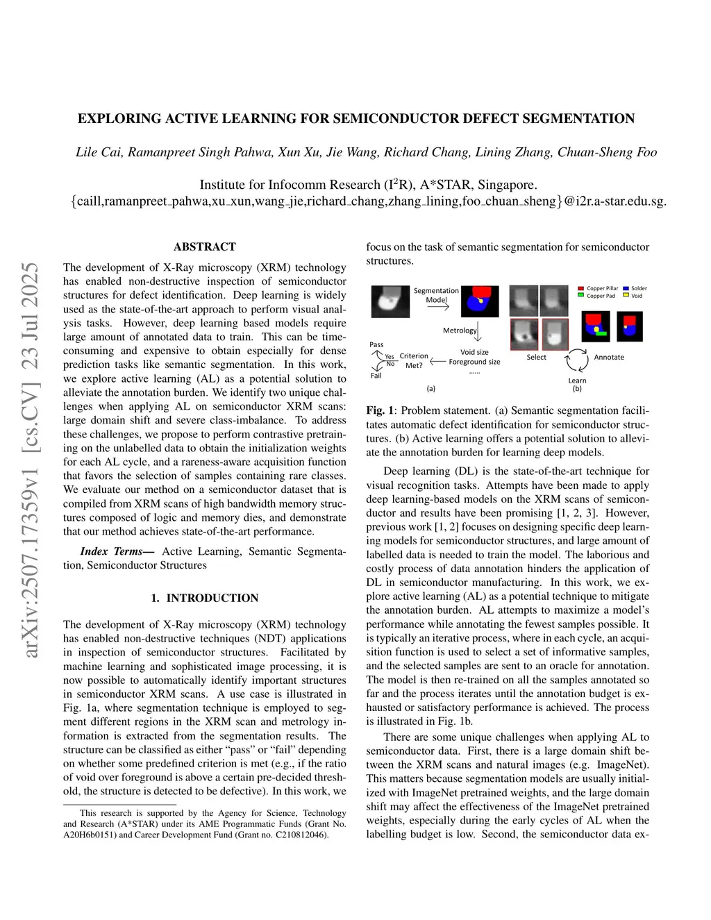 The development of X-Ray microscopy (XRM) technology has enabled non-destructive inspection of semiconductor structures for defect identification. Deep learning is widely used as the state-of-the-art approach to perform visual analysis tasks. However, deep learning based models require large amount of annotated data to train. This can be time-consuming and expensive to obtain especially for dense prediction tasks like semantic segmentation. In this work, we explore active learning (AL) as a potential solution to alleviate the annotation burden. We identify two unique challenges when applying AL on semiconductor XRM scans: large domain shift and severe class-imbalance. To address these challenges, we propose to perform contrastive pretraining on the unlabelled data to obtain the initialization weights for each AL cycle, and a rareness-aware acquisition function that favors the selection of samples containing rare classes. We evaluate our method on a semiconductor dataset that is compiled from XRM scans of high bandwidth memory structures composed of logic and memory dies, and demonstrate that our method achieves state-of-the-art performance.