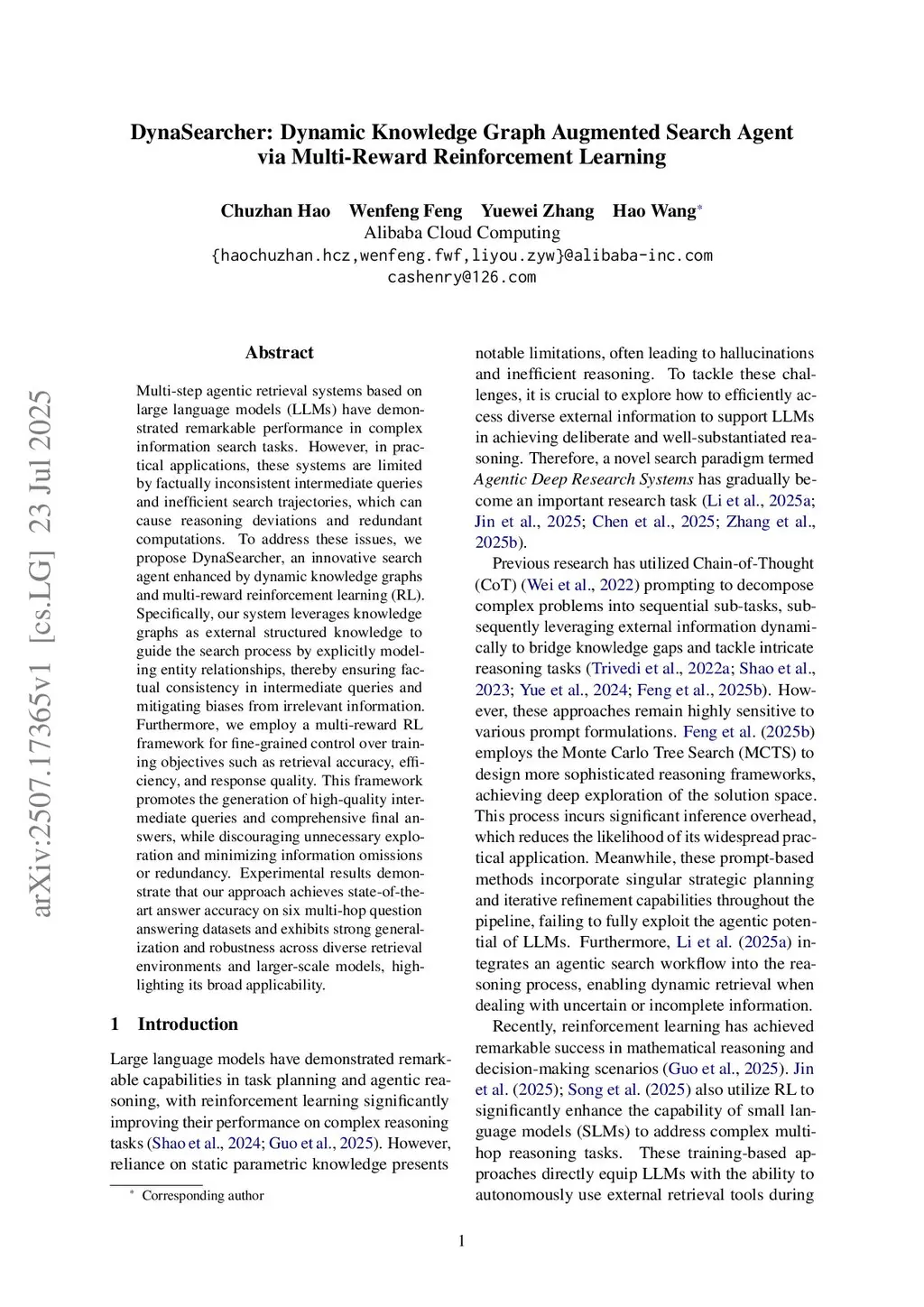 Multi-step agentic retrieval systems based on large language models (LLMs) have demonstrated remarkable performance in complex information search tasks. However, these systems still face significant challenges in practical applications, particularly in generating factually inconsistent intermediate queries and inefficient search trajectories, which can lead to reasoning deviations or redundant computations. To address these issues, we propose DynaSearcher, an innovative search agent enhanced by dynamic knowledge graphs and multi-reward reinforcement learning (RL). Specifically, our system leverages knowledge graphs as external structured knowledge to guide the search process by explicitly modeling entity relationships, thereby ensuring factual consistency in intermediate queries and mitigating biases from irrelevant information. Furthermore, we employ a multi-reward RL framework for fine-grained control over training objectives such as retrieval accuracy, efficiency, and response quality. This framework promotes the generation of high-quality intermediate queries and comprehensive final answers, while discouraging unnecessary exploration and minimizing information omissions or redundancy. Experimental results demonstrate that our approach achieves state-of-the-art answer accuracy on six multi-hop question answering datasets, matching frontier LLMs while using only small-scale models and limited computational resources. Furthermore, our approach demonstrates strong generalization and robustness across diverse retrieval environments and larger-scale models, highlighting its broad applicability.