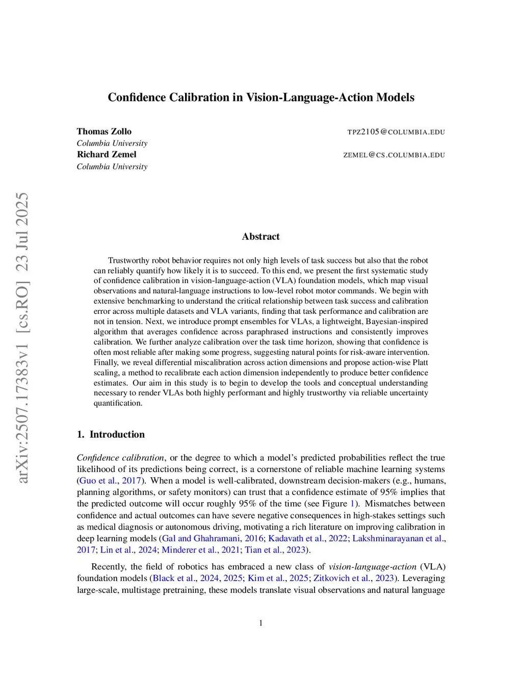 Trustworthy robot behavior requires not only high levels of task success but also that the robot can reliably quantify how likely it is to succeed. To this end, we present a first-of-its-kind study of confidence calibration in vision-language-action (VLA) foundation models, which map visual observations and natural language instructions to low-level robot motor commands. We establish a confidence baseline for VLAs, examine how task success relates to calibration error and how calibration evolves over time, and introduce two lightweight techniques to remedy the miscalibration we observe: prompt ensembles and action-wise Platt scaling. Our aim in this study is to begin to develop the tools and conceptual understanding necessary to render VLAs both highly performant and highly trustworthy via reliable uncertainty quantification.