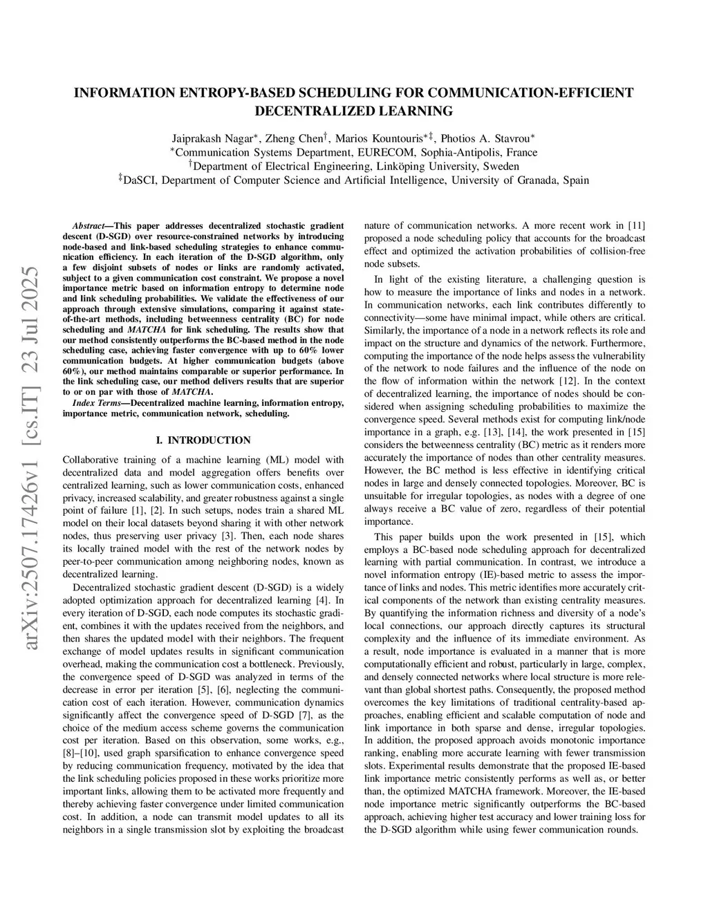 This paper addresses decentralized stochastic gradient descent (D-SGD) over resource-constrained networks by introducing node-based and link-based scheduling strategies to enhance communication efficiency. In each iteration of the D-SGD algorithm, only a few disjoint subsets of nodes or links are randomly activated, subject to a given communication cost constraint. We propose a novel importance metric based on information entropy to determine node and link scheduling probabilities. We validate the effectiveness of our approach through extensive simulations, comparing it against state-of-the-art methods, including betweenness centrality (BC) for node scheduling and \textit{MATCHA} for link scheduling. The results show that our method consistently outperforms the BC-based method in the node scheduling case, achieving faster convergence with up to 60\% lower communication budgets. At higher communication budgets (above 60\%), our method maintains comparable or superior performance. In the link scheduling case, our method delivers results that are superior to or on par with those of \textit{MATCHA}.
