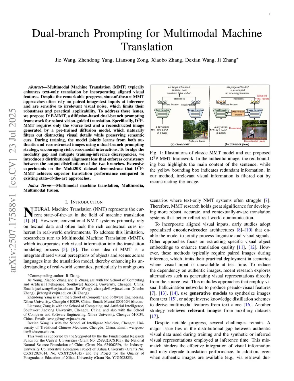Multimodal Machine Translation (MMT) typically enhances text-only translation by incorporating aligned visual features. Despite the remarkable progress, state-of-the-art MMT approaches often rely on paired image-text inputs at inference and are sensitive to irrelevant visual noise, which limits their robustness and practical applicability. To address these issues, we propose D2P-MMT, a diffusion-based dual-branch prompting framework for robust vision-guided translation. Specifically, D2P-MMT requires only the source text and a reconstructed image generated by a pre-trained diffusion model, which naturally filters out distracting visual details while preserving semantic cues. During training, the model jointly learns from both authentic and reconstructed images using a dual-branch prompting strategy, encouraging rich cross-modal interactions. To bridge the modality gap and mitigate training-inference discrepancies, we introduce a distributional alignment loss that enforces consistency between the output distributions of the two branches. Extensive experiments on the Multi30K dataset demonstrate that D2P-MMT achieves superior translation performance compared to existing state-of-the-art approaches.
