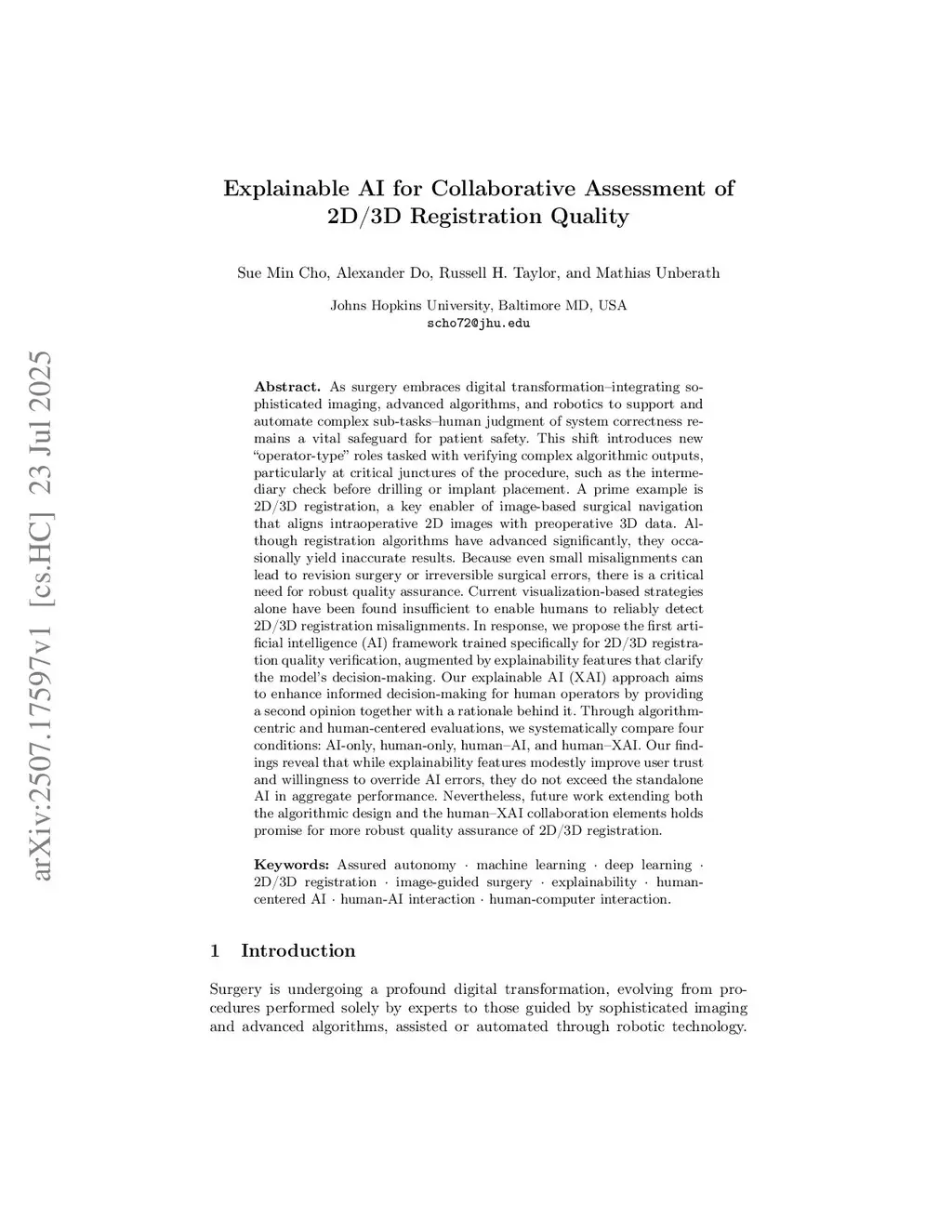 Purpose: As surgery increasingly integrates advanced imaging, algorithms, and robotics to automate complex tasks, human judgment of system correctness remains a vital safeguard for patient safety. A critical example is 2D/3D registration, where small registration misalignments can lead to surgical errors. Current visualization strategies alone are insufficient to reliably enable humans to detect these misalignments, highlighting the need for enhanced decision-support tools.Methods: We propose the first artificial intelligence (AI) model tailored to 2D/3D registration quality assessment, augmented with explainable AI (XAI) mechanisms to clarify the model's predictions. Using both objective measures (e.g., accuracy, sensitivity, precision, specificity) and subjective evaluations (e.g., workload, trust, and understanding), we systematically compare decision-making across four conditions: AI-only, Human-only, Human+AI, and Human+XAI.Results: The AI-only condition achieved the highest accuracy, whereas collaborative paradigms (Human+AI and Human+XAI) improved sensitivity, precision, and specificity compared to standalone approaches. Participants experienced significantly lower workload in collaborative conditions relative to the Human-only condition. Moreover, participants reported a greater understanding of AI predictions in the Human+XAI condition than in Human+AI, although no significant differences were observed between the two collaborative paradigms in perceived trust or workload.Conclusion: Human-AI collaboration can enhance 2D/3D registration quality assurance, with explainability mechanisms improving user understanding. Future work should refine XAI designs to optimize decision-making performance and efficiency. Extending both the algorithmic design and human-XAI collaboration elements holds promise for more robust quality assurance of 2D/3D registration.