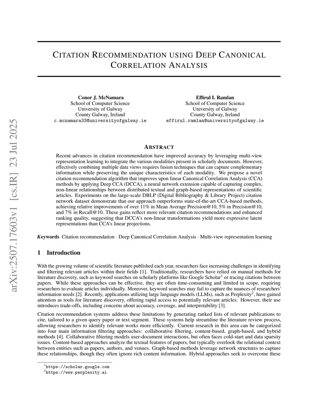 Citation Recommendation using Deep Canonical Correlation Analysis
