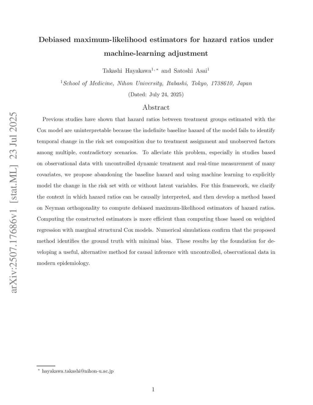 Previous studies have shown that hazard ratios between treatment groups estimated with the Cox model are uninterpretable because the unspecified baseline hazard of the model fails to identify temporal change in the risk set composition due to treatment assignment and unobserved factors among multiple, contradictory scenarios. To alleviate this problem, especially in studies based on observational data with uncontrolled dynamic treatment and real-time measurement of many covariates, we propose abandoning the baseline hazard and using kernel-based machine learning to explicitly model the change in the risk set with or without latent variables. For this framework, we clarify the context in which hazard ratios can be causally interpreted, and then develop a method based on Neyman orthogonality to compute debiased maximum-likelihood estimators of hazard ratios, proving necessary convergence results. Numerical simulations confirm that the proposed method identifies the true hazard ratios with minimal bias. These results lay the foundation for developing a useful, alternative method for causal inference with uncontrolled, observational data in modern epidemiology.