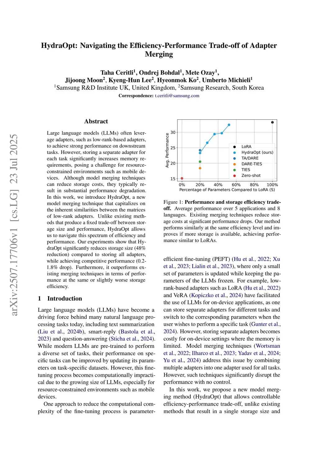 Large language models (LLMs) often leverage adapters, such as low-rank-based adapters, to achieve strong performance on downstream tasks. However, storing a separate adapter for each task significantly increases memory requirements, posing a challenge for resource-constrained environments such as mobile devices. Although model merging techniques can reduce storage costs, they typically result in substantial performance degradation. In this work, we introduce HydraOpt, a new model merging technique that capitalizes on the inherent similarities between the matrices of low-rank adapters. Unlike existing methods that produce a fixed trade-off between storage size and performance, HydraOpt allows us to navigate this spectrum of efficiency and performance. Our experiments show that HydraOpt significantly reduces storage size (48% reduction) compared to storing all adapters, while achieving competitive performance (0.2-1.8% drop). Furthermore, it outperforms existing merging techniques in terms of performance at the same or slightly worse storage efficiency.