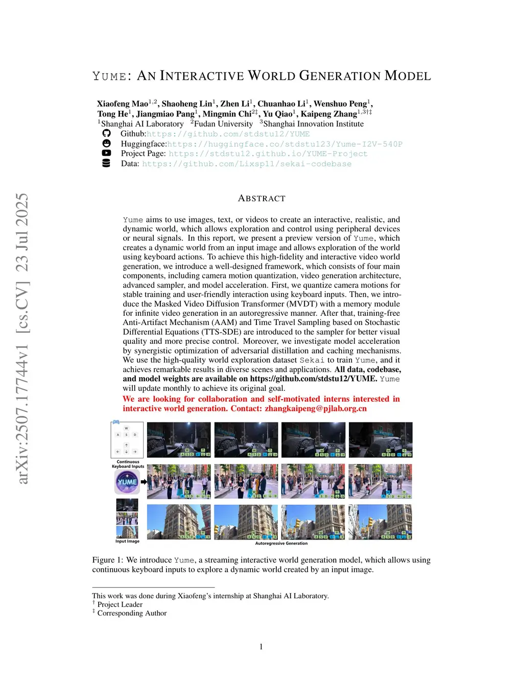 Yume aims to use images, text, or videos to create an interactive, realistic, and dynamic world, which allows exploration and control using peripheral devices or neural signals. In this report, we present a preview version of \method, which creates a dynamic world from an input image and allows exploration of the world using keyboard actions. To achieve this high-fidelity and interactive video world generation, we introduce a well-designed framework, which consists of four main components, including camera motion quantization, video generation architecture, advanced sampler, and model acceleration. First, we quantize camera motions for stable training and user-friendly interaction using keyboard inputs. Then, we introduce the Masked Video Diffusion Transformer~(MVDT) with a memory module for infinite video generation in an autoregressive manner. After that, training-free Anti-Artifact Mechanism (AAM) and Time Travel Sampling based on Stochastic Differential Equations (TTS-SDE) are introduced to the sampler for better visual quality and more precise control. Moreover, we investigate model acceleration by synergistic optimization of adversarial distillation and caching mechanisms. We use the high-quality world exploration dataset \sekai to train \method, and it achieves remarkable results in diverse scenes and applications. All data, codebase, and model weights are available onthis https URL. Yume will update monthly to achieve its original goal. Project page:this https URL.