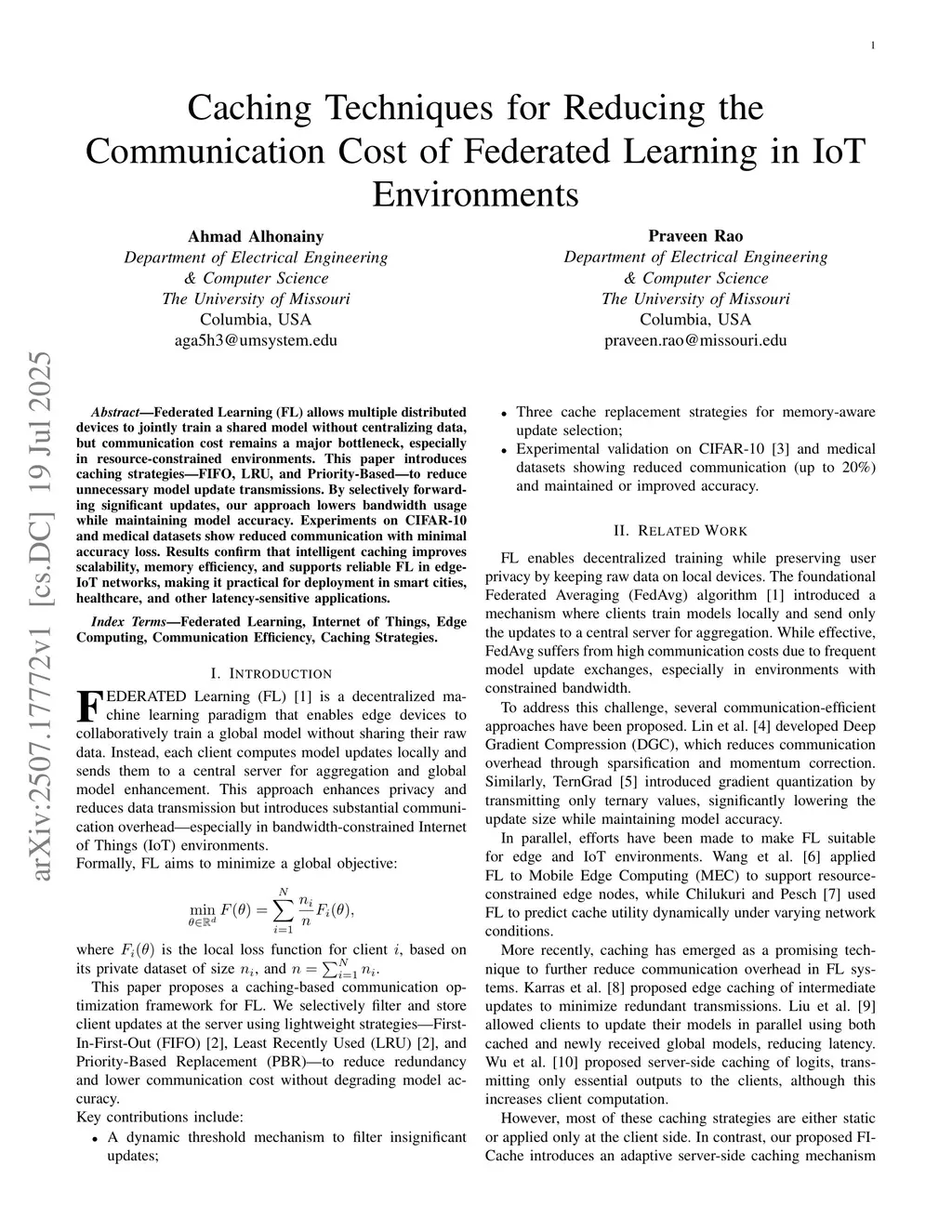 Federated Learning (FL) allows multiple distributed devices to jointly train a shared model without centralizing data, but communication cost remains a major bottleneck, especially in resource-constrained environments. This paper introduces caching strategies - FIFO, LRU, and Priority-Based - to reduce unnecessary model update transmissions. By selectively forwarding significant updates, our approach lowers bandwidth usage while maintaining model accuracy. Experiments on CIFAR-10 and medical datasets show reduced communication with minimal accuracy loss. Results confirm that intelligent caching improves scalability, memory efficiency, and supports reliable FL in edge IoT networks, making it practical for deployment in smart cities, healthcare, and other latency-sensitive applications.