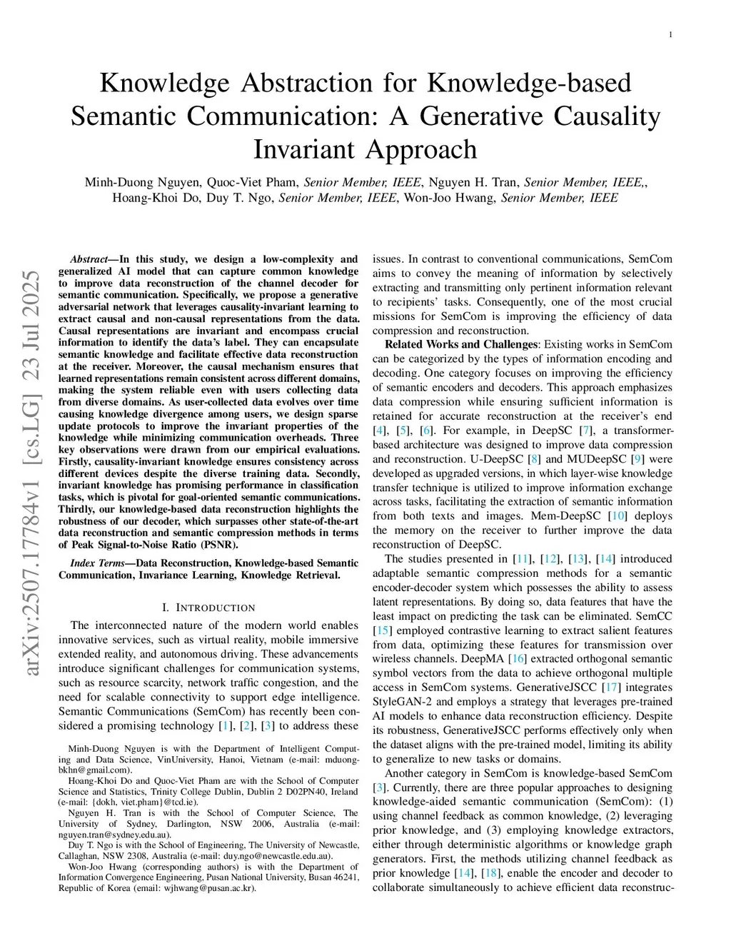 In this study, we design a low-complexity and generalized AI model that can capture common knowledge to improve data reconstruction of the channel decoder for semantic communication. Specifically, we propose a generative adversarial network that leverages causality-invariant learning to extract causal and non-causal representations from the data. Causal representations are invariant and encompass crucial information to identify the data's label. They can encapsulate semantic knowledge and facilitate effective data reconstruction at the receiver. Moreover, the causal mechanism ensures that learned representations remain consistent across different domains, making the system reliable even with users collecting data from diverse domains. As user-collected data evolves over time causing knowledge divergence among users, we design sparse update protocols to improve the invariant properties of the knowledge while minimizing communication overheads. Three key observations were drawn from our empirical evaluations. Firstly, causality-invariant knowledge ensures consistency across different devices despite the diverse training data. Secondly, invariant knowledge has promising performance in classification tasks, which is pivotal for goal-oriented semantic communications. Thirdly, our knowledge-based data reconstruction highlights the robustness of our decoder, which surpasses other state-of-the-art data reconstruction and semantic compression methods in terms of Peak Signal-to-Noise Ratio (PSNR).