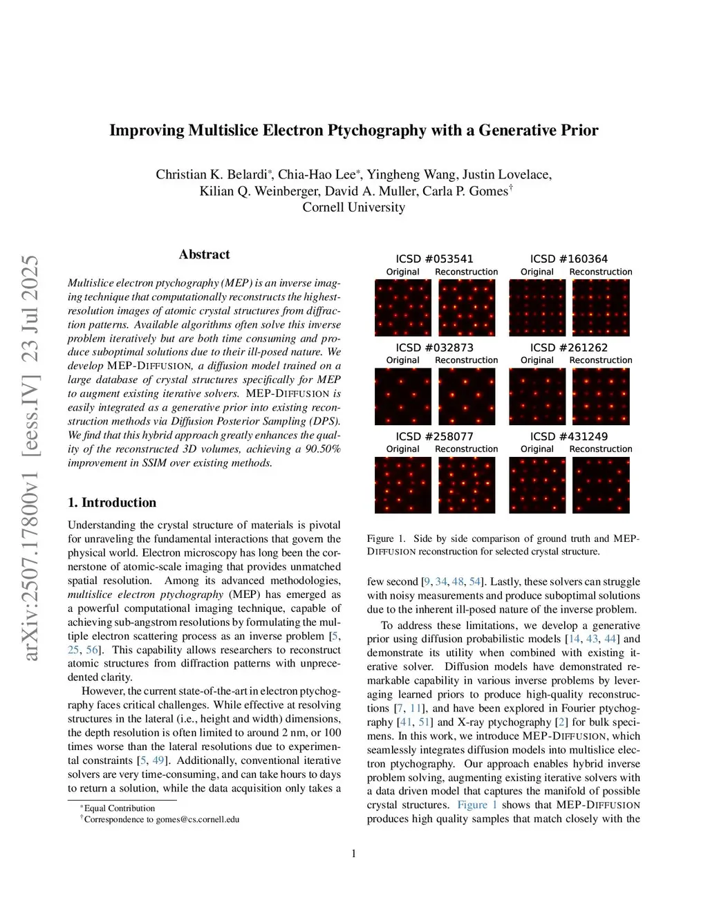 Multislice electron ptychography (MEP) is an inverse imaging technique that computationally reconstructs the highest-resolution images of atomic crystal structures from diffraction patterns. Available algorithms often solve this inverse problem iteratively but are both time consuming and produce suboptimal solutions due to their ill-posed nature. We develop MEP-Diffusion, a diffusion model trained on a large database of crystal structures specifically for MEP to augment existing iterative solvers. MEP-Diffusion is easily integrated as a generative prior into existing reconstruction methods via Diffusion Posterior Sampling (DPS). We find that this hybrid approach greatly enhances the quality of the reconstructed 3D volumes, achieving a 90.50% improvement in SSIM over existing methods.