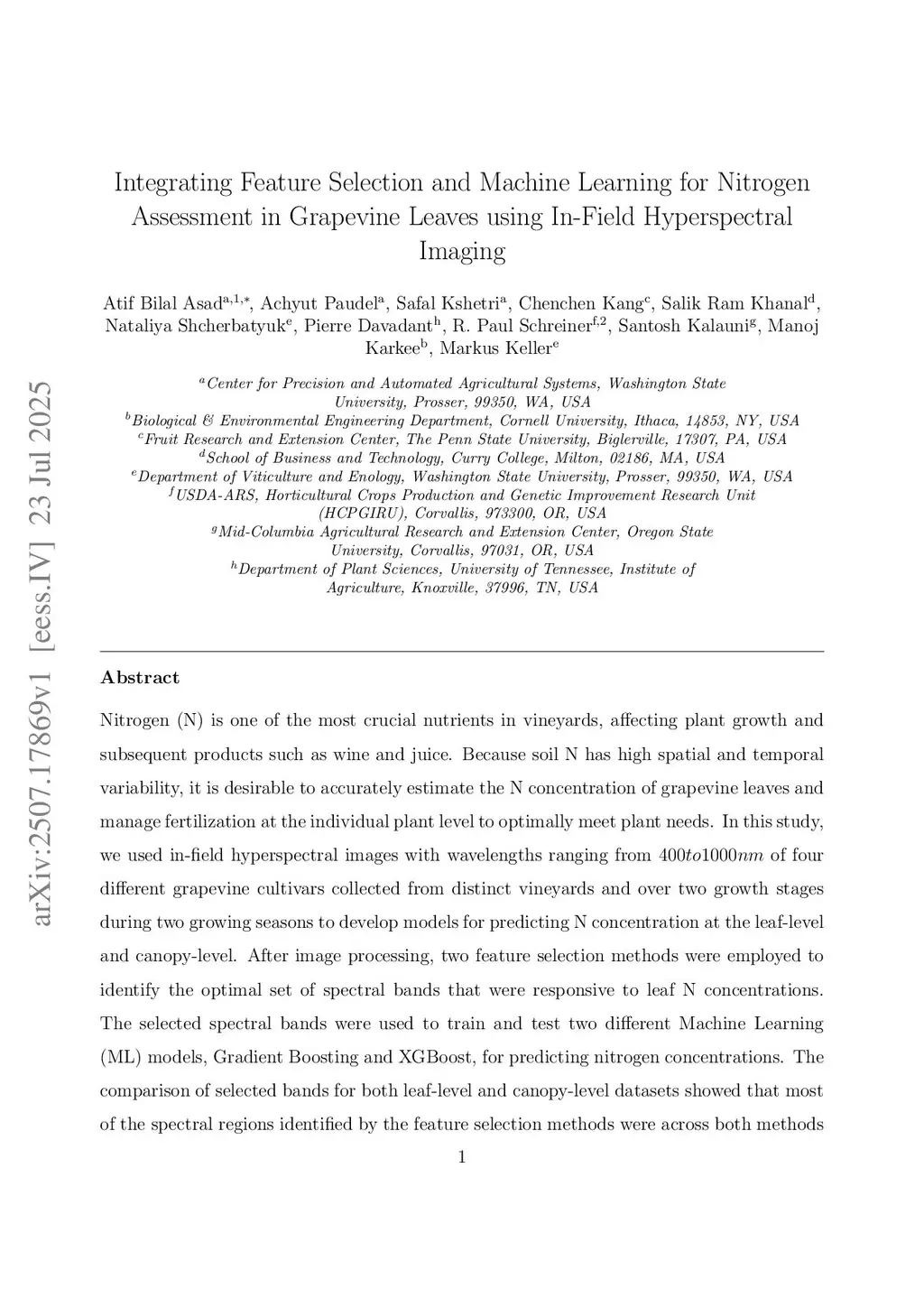 Integrating Feature Selection and Machine Learning for Nitrogen Assessment in Grapevine Leaves using In-Field Hyperspectral Imaging
