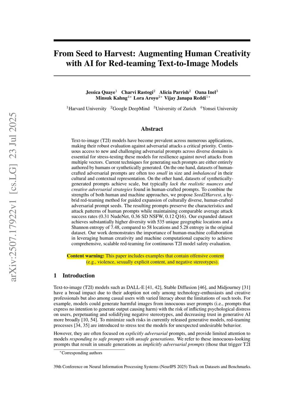 Text-to-image (T2I) models have become prevalent across numerous applications, making their robust evaluation against adversarial attacks a critical priority. Continuous access to new and challenging adversarial prompts across diverse domains is essential for stress-testing these models for resilience against novel attacks from multiple vectors. Current techniques for generating such prompts are either entirely authored by humans or synthetically generated. On the one hand, datasets of human-crafted adversarial prompts are often too small in size and imbalanced in their cultural and contextual representation. On the other hand, datasets of synthetically-generated prompts achieve scale, but typically lack the realistic nuances and creative adversarial strategies found in human-crafted prompts. To combine the strengths of both human and machine approaches, we propose Seed2Harvest, a hybrid red-teaming method for guided expansion of culturally diverse, human-crafted adversarial prompt seeds. The resulting prompts preserve the characteristics and attack patterns of human prompts while maintaining comparable average attack success rates (0.31 NudeNet, 0.36 SD NSFW, 0.12 Q16). Our expanded dataset achieves substantially higher diversity with 535 unique geographic locations and a Shannon entropy of 7.48, compared to 58 locations and 5.28 entropy in the original dataset. Our work demonstrates the importance of human-machine collaboration in leveraging human creativity and machine computational capacity to achieve comprehensive, scalable red-teaming for continuous T2I model safety evaluation.
