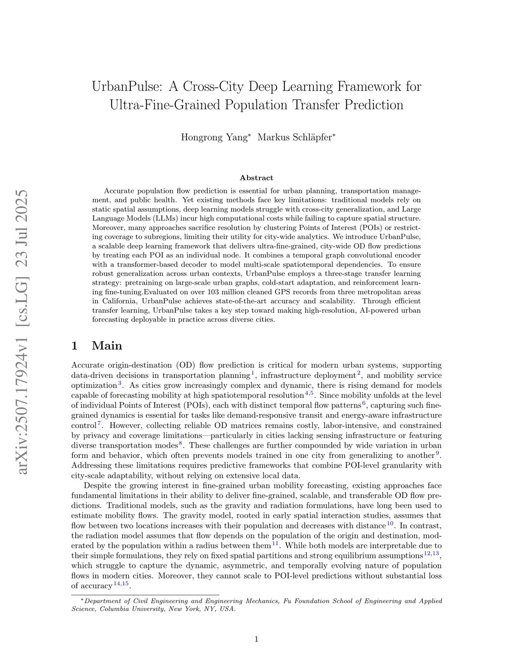Accurate population flow prediction is essential for urban planning, transportation management, and public health. Yet existing methods face key limitations: traditional models rely on static spatial assumptions, deep learning models struggle with cross-city generalization, and Large Language Models (LLMs) incur high computational costs while failing to capture spatial structure. Moreover, many approaches sacrifice resolution by clustering Points of Interest (POIs) or restricting coverage to subregions, limiting their utility for city-wide analytics. We introduce UrbanPulse, a scalable deep learning framework that delivers ultra-fine-grained, city-wide OD flow predictions by treating each POI as an individual node. It combines a temporal graph convolutional encoder with a transformer-based decoder to model multi-scale spatiotemporal dependencies. To ensure robust generalization across urban contexts, UrbanPulse employs a three-stage transfer learning strategy: pretraining on large-scale urban graphs, cold-start adaptation, and reinforcement learningthis http URLon over 103 million cleaned GPS records from three metropolitan areas in California, UrbanPulse achieves state-of-the-art accuracy and scalability. Through efficient transfer learning, UrbanPulse takes a key step toward making high-resolution, AI-powered urban forecasting deployable in practice across diverse cities.
