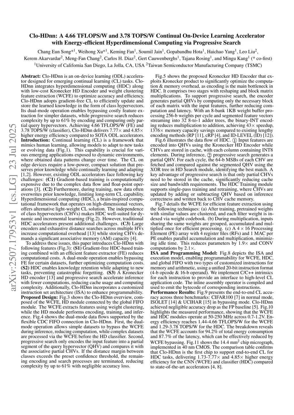 Clo-HDnn is an on-device learning (ODL) accelerator designed for emerging continual learning (CL) tasks. Clo-HDnn integrates hyperdimensional computing (HDC) along with low-cost Kronecker HD Encoder and weight clustering feature extraction (WCFE) to optimize accuracy and efficiency. Clo-HDnn adopts gradient-free CL to efficiently update and store the learned knowledge in the form of class hypervectors. Its dual-mode operation enables bypassing costly feature extraction for simpler datasets, while progressive search reduces complexity by up to 61% by encoding and comparing only partial query hypervectors. Achieving 4.66 TFLOPS/W (FE) and 3.78 TOPS/W (classifier), Clo-HDnn delivers 7.77x and 4.85x higher energy efficiency compared to SOTA ODL accelerators.