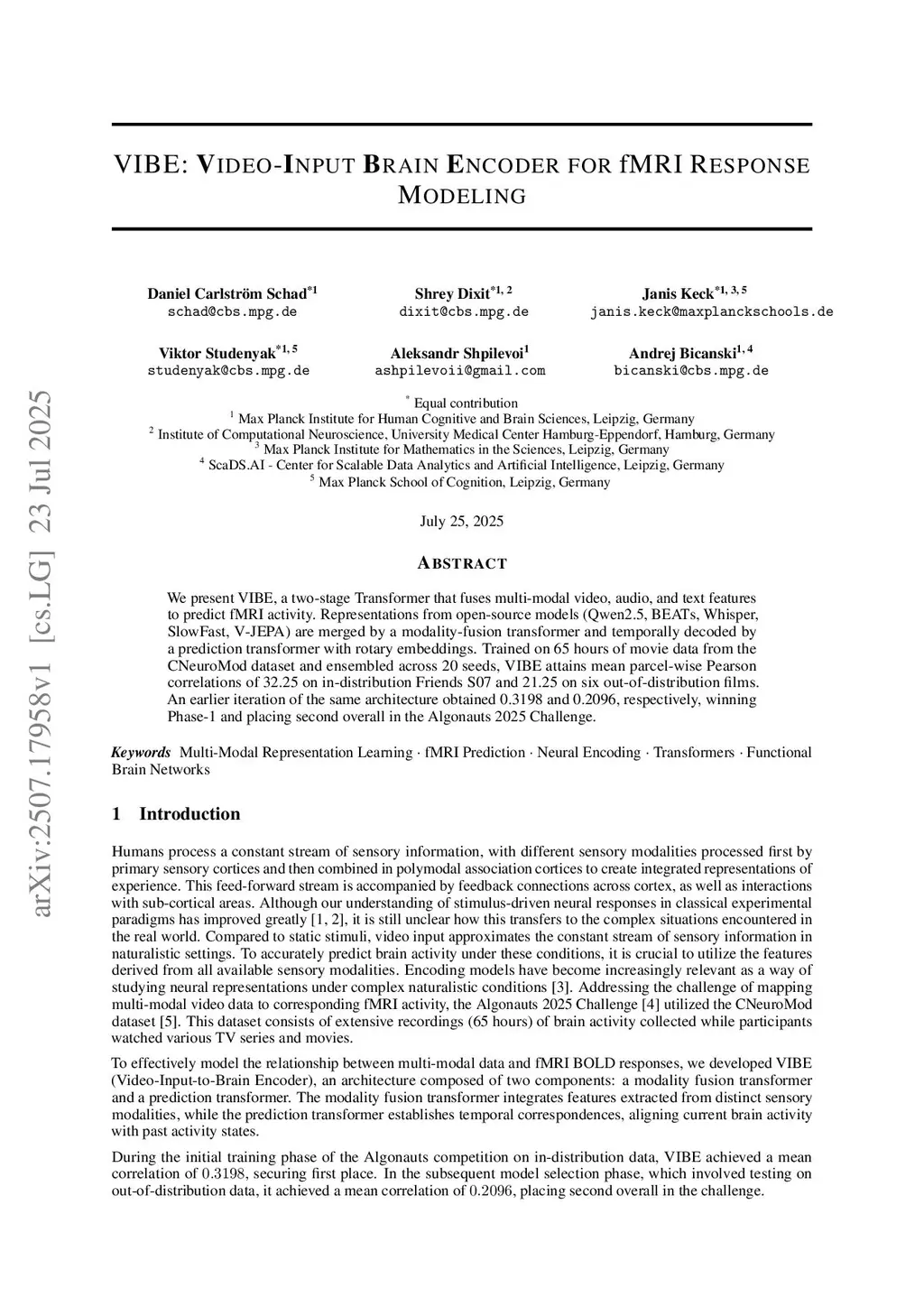 We present VIBE, a two-stage Transformer that fuses multi-modal video, audio, and text features to predict fMRI activity. Representations from open-source models (Qwen2.5, BEATs, Whisper, SlowFast, V-JEPA) are merged by a modality-fusion transformer and temporally decoded by a prediction transformer with rotary embeddings. Trained on 65 hours of movie data from the CNeuroMod dataset and ensembled across 20 seeds, VIBE attains mean parcel-wise Pearson correlations of 0.3225 on in-distribution Friends S07 and 0.2125 on six out-of-distribution films. An earlier iteration of the same architecture obtained 0.3198 and 0.2096, respectively, winning Phase-1 and placing second overall in the Algonauts 2025 Challenge.