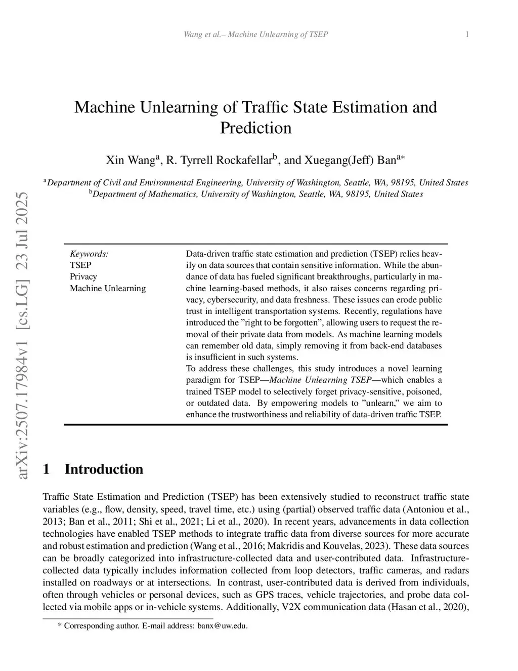 Data-driven traffic state estimation and prediction (TSEP) relies heavily on data sources that contain sensitive information. While the abundance of data has fueled significant breakthroughs, particularly in machine learning-based methods, it also raises concerns regarding privacy, cybersecurity, and data freshness. These issues can erode public trust in intelligent transportation systems. Recently, regulations have introduced the "right to be forgotten", allowing users to request the removal of their private data from models. As machine learning models can remember old data, simply removing it from back-end databases is insufficient in such systems. To address these challenges, this study introduces a novel learning paradigm for TSEP-Machine Unlearning TSEP-which enables a trained TSEP model to selectively forget privacy-sensitive, poisoned, or outdated data. By empowering models to "unlearn," we aim to enhance the trustworthiness and reliability of data-driven traffic TSEP.