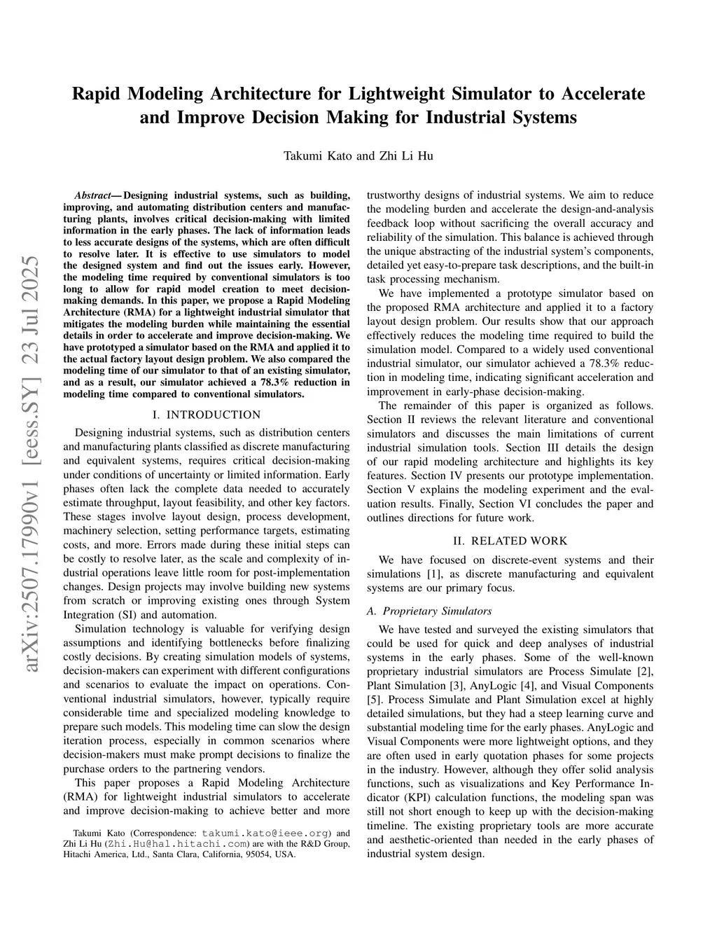 Designing industrial systems, such as building, improving, and automating distribution centers and manufacturing plants, involves critical decision-making with limited information in the early phases. The lack of information leads to less accurate designs of the systems, which are often difficult to resolve later. It is effective to use simulators to model the designed system and find out the issues early. However, the modeling time required by conventional simulators is too long to allow for rapid model creation to meet decision-making demands. In this paper, we propose a Rapid Modeling Architecture (RMA) for a lightweight industrial simulator that mitigates the modeling burden while maintaining the essential details in order to accelerate and improve decision-making. We have prototyped a simulator based on the RMA and applied it to the actual factory layout design problem. We also compared the modeling time of our simulator to that of an existing simulator, and as a result, our simulator achieved a 78.3% reduction in modeling time compared to conventional simulators.