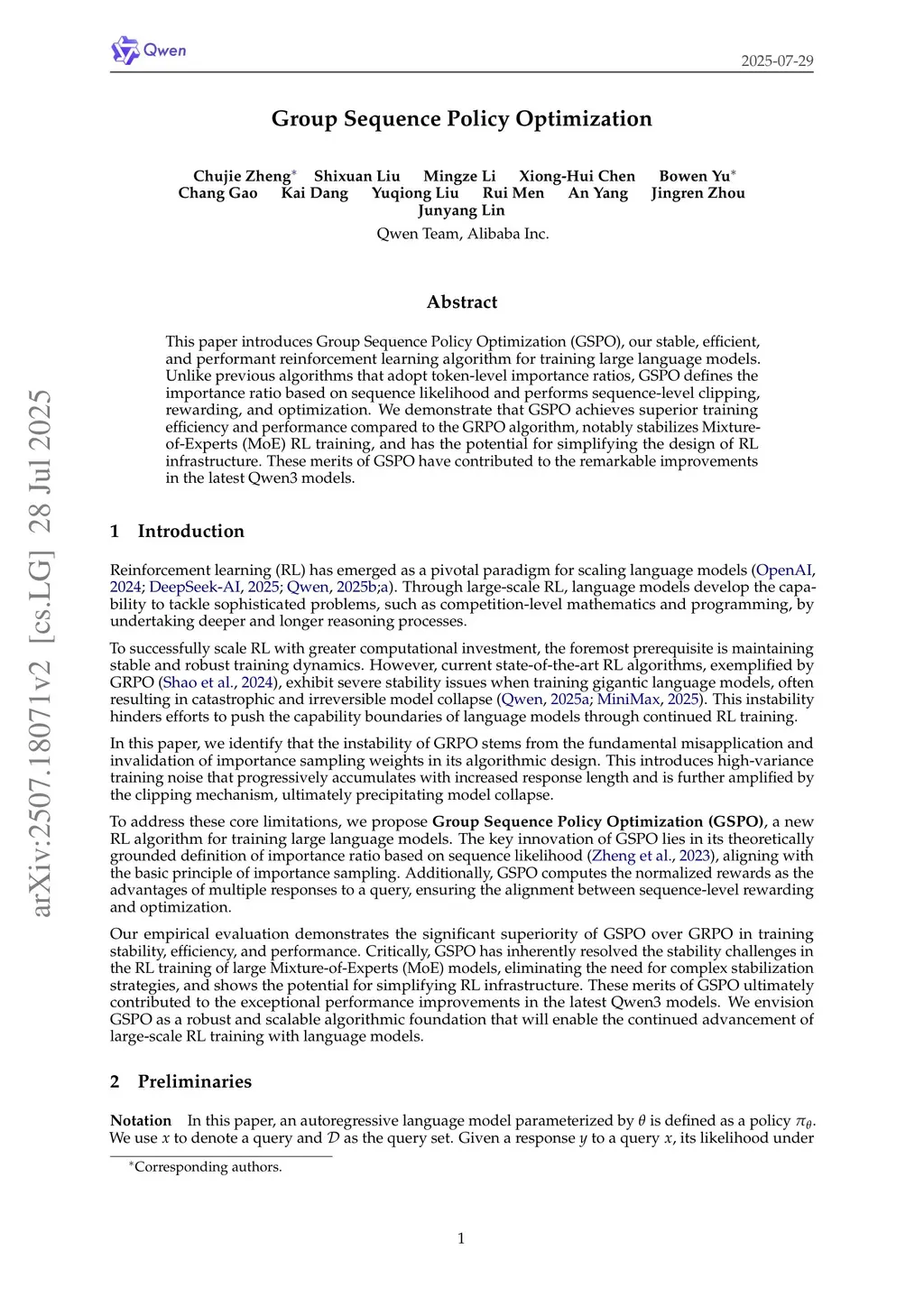 This paper introduces Group Sequence Policy Optimization (GSPO), our stable, efficient, and performant reinforcement learning algorithm for training large language models. Unlike previous algorithms that adopt token-level importance ratios, GSPO defines the importance ratio based on sequence likelihood and performs sequence-level clipping, rewarding, and optimization. We demonstrate that GSPO achieves superior training efficiency and performance compared to the GRPO algorithm, notably stabilizes Mixture-of-Experts (MoE) RL training, and has the potential for simplifying the design of RL infrastructure. These merits of GSPO have contributed to the remarkable improvements in the latest Qwen3 models.