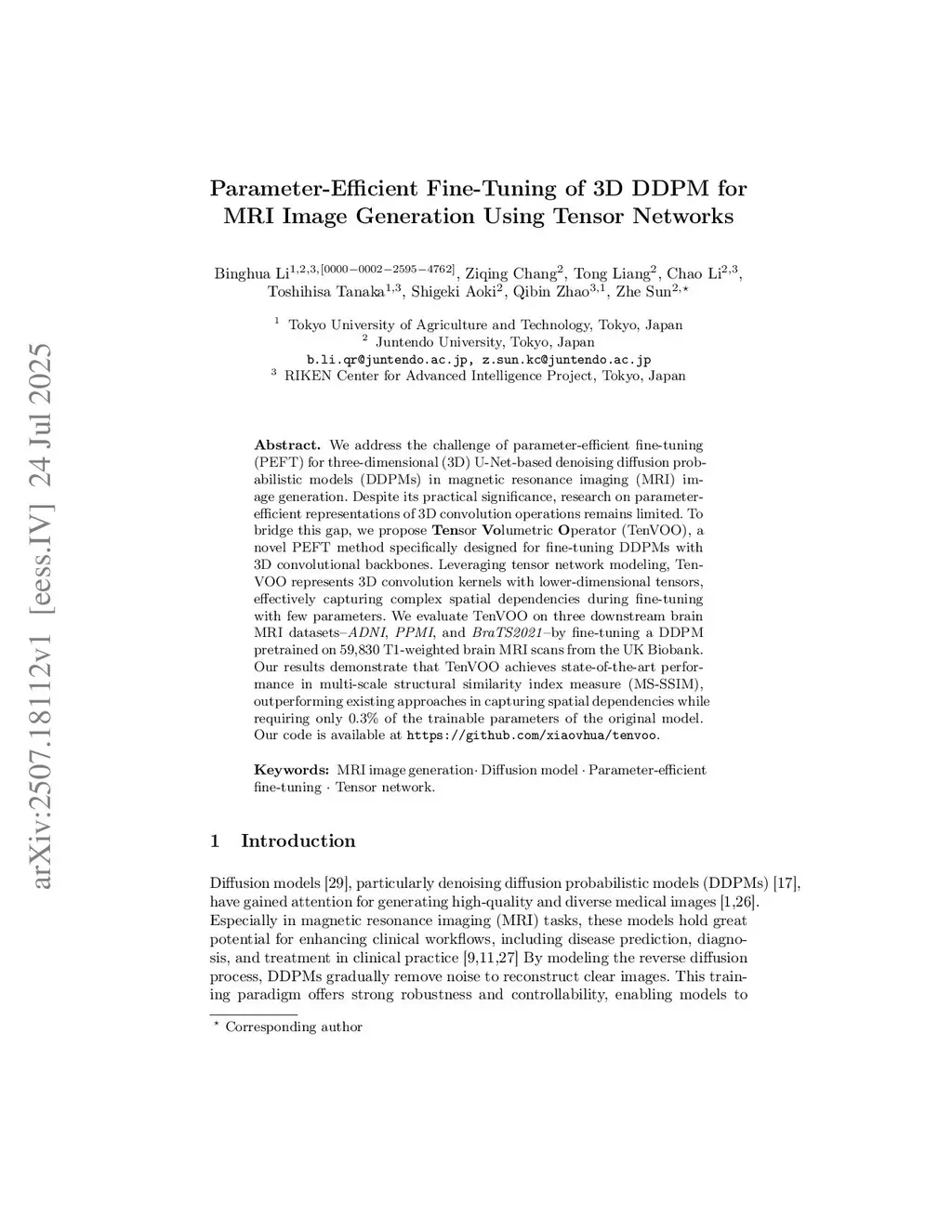 We address the challenge of parameter-efficient fine-tuning (PEFT) for three-dimensional (3D) U-Net-based denoising diffusion probabilistic models (DDPMs) in magnetic resonance imaging (MRI) image generation. Despite its practical significance, research on parameter-efficient representations of 3D convolution operations remains limited. To bridge this gap, we propose Tensor Volumetric Operator (TenVOO), a novel PEFT method specifically designed for fine-tuning DDPMs with 3D convolutional backbones. Leveraging tensor network modeling, TenVOO represents 3D convolution kernels with lower-dimensional tensors, effectively capturing complex spatial dependencies during fine-tuning with few parameters. We evaluate TenVOO on three downstream brain MRI datasets-ADNI, PPMI, and BraTS2021-by fine-tuning a DDPM pretrained on 59,830 T1-weighted brain MRI scans from the UK Biobank. Our results demonstrate that TenVOO achieves state-of-the-art performance in multi-scale structural similarity index measure (MS-SSIM), outperforming existing approaches in capturing spatial dependencies while requiring only 0.3% of the trainable parameters of the original model. Our code is available at:this https URL
