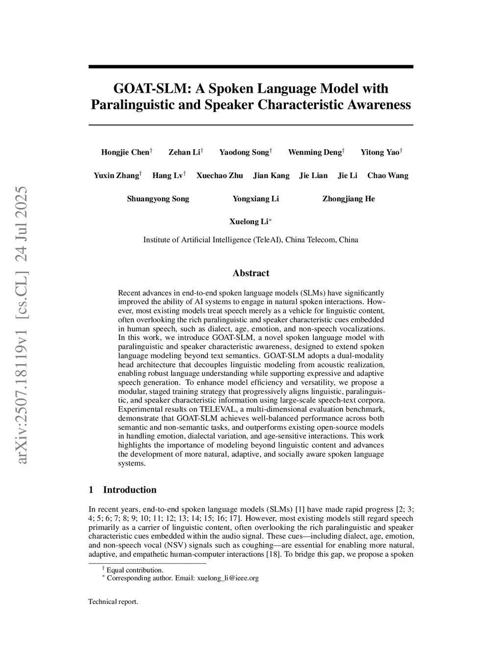 Recent advances in end-to-end spoken language models (SLMs) have significantly improved the ability of AI systems to engage in natural spoken interactions. However, most existing models treat speech merely as a vehicle for linguistic content, often overlooking the rich paralinguistic and speaker characteristic cues embedded in human speech, such as dialect, age, emotion, and non-speech vocalizations. In this work, we introduce GOAT-SLM, a novel spoken language model with paralinguistic and speaker characteristic awareness, designed to extend spoken language modeling beyond text semantics. GOAT-SLM adopts a dual-modality head architecture that decouples linguistic modeling from acoustic realization, enabling robust language understanding while supporting expressive and adaptive speech generation. To enhance model efficiency and versatility, we propose a modular, staged training strategy that progressively aligns linguistic, paralinguistic, and speaker characteristic information using large-scale speech-text corpora. Experimental results on TELEVAL, a multi-dimensional evaluation benchmark, demonstrate that GOAT-SLM achieves well-balanced performance across both semantic and non-semantic tasks, and outperforms existing open-source models in handling emotion, dialectal variation, and age-sensitive interactions. This work highlights the importance of modeling beyond linguistic content and advances the development of more natural, adaptive, and socially aware spoken language systems.