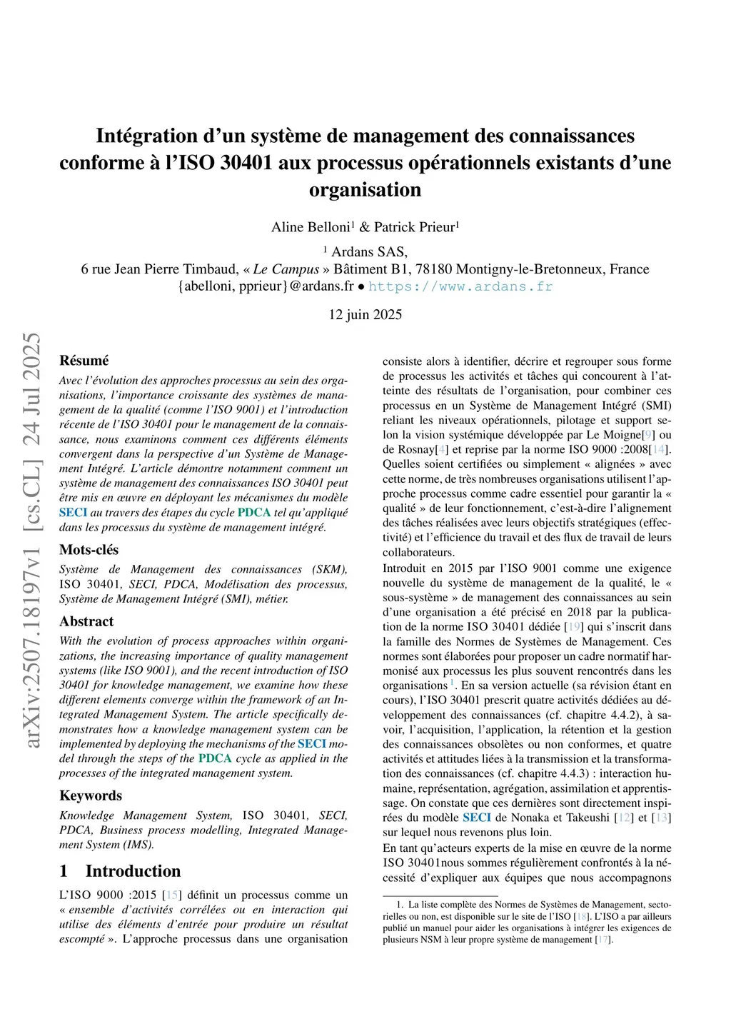 Business process modeling is used by most organizations as an essential framework for ensuring efficiency and effectiveness of the work and workflow performed by its employees and for ensuring the alignment of such work with its strategic goals. For organizations that are compliant or near-compliant with ISO 9001, this approach involves the detailed mapping of processes, sub-processes, activities, and tasks. ISO30401 is a Management System Standard, introduced in 2018, establishing universal requirements for the set up of a Knowledge Management System in an organization. As ``ISO30401 implementers'' we regularly face the challenge of explaining our clients how the knowledge development, transformation and conveyances activities depicted in ISO30401 do integrate with existing operational processes. This article recaps process modelling principles in the context of ISO9001 and explores, based on our experience, how an ISO30401-compliant Knowledge Management System (KMS) entwines with all other processes of an Integrated Management System and in particular how it can be implemented by deploying the mechanisms of the SECI model through the steps of PDCA cycles.