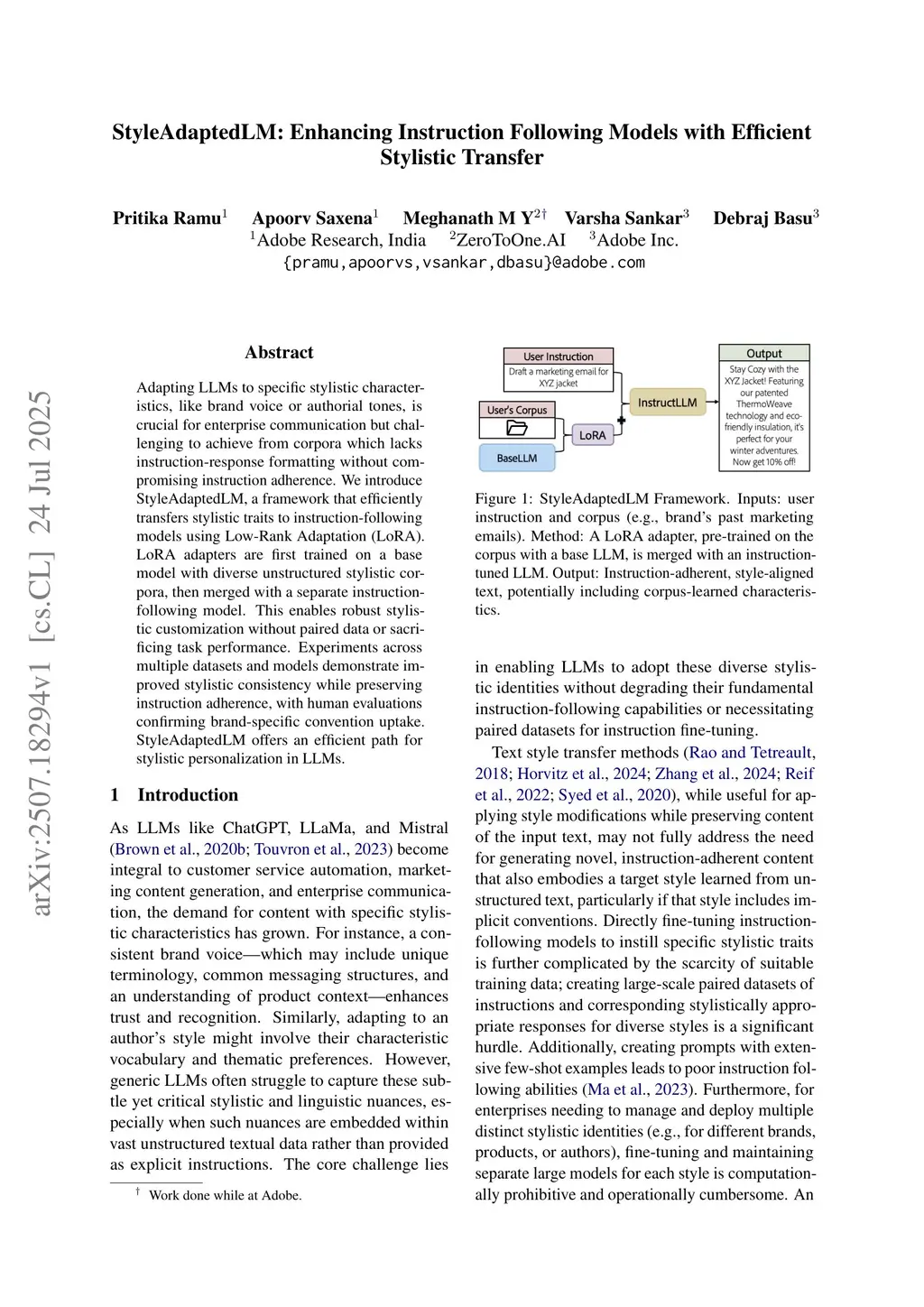 Adapting LLMs to specific stylistic characteristics, like brand voice or authorial tones, is crucial for enterprise communication but challenging to achieve from corpora which lacks instruction-response formatting without compromising instruction adherence. We introduce StyleAdaptedLM, a framework that efficiently transfers stylistic traits to instruction-following models using Low-Rank Adaptation (LoRA). LoRA adapters are first trained on a base model with diverse unstructured stylistic corpora, then merged with a separate instruction-following model. This enables robust stylistic customization without paired data or sacrificing task performance. Experiments across multiple datasets and models demonstrate improved stylistic consistency while preserving instruction adherence, with human evaluations confirming brand-specific convention uptake. StyleAdaptedLM offers an efficient path for stylistic personalization in LLMs.