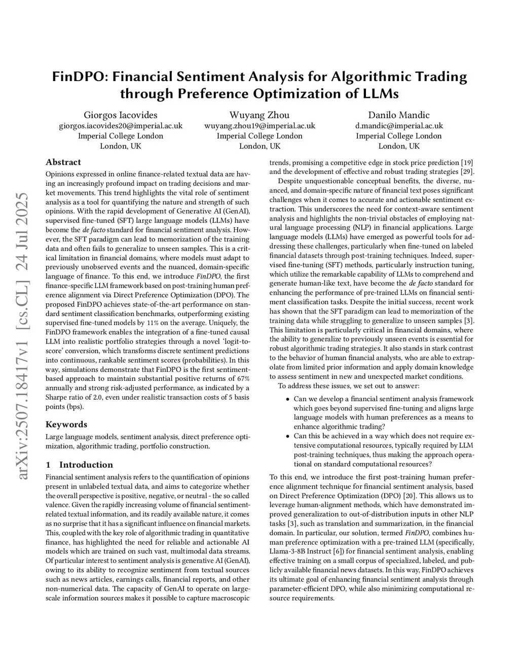 Opinions expressed in online finance-related textual data are having an increasingly profound impact on trading decisions and market movements. This trend highlights the vital role of sentiment analysis as a tool for quantifying the nature and strength of such opinions. With the rapid development of Generative AI (GenAI), supervised fine-tuned (SFT) large language models (LLMs) have become the de facto standard for financial sentiment analysis. However, the SFT paradigm can lead to memorization of the training data and often fails to generalize to unseen samples. This is a critical limitation in financial domains, where models must adapt to previously unobserved events and the nuanced, domain-specific language of finance. To this end, we introduce FinDPO, the first finance-specific LLM framework based on post-training human preference alignment via Direct Preference Optimization (DPO). The proposed FinDPO achieves state-of-the-art performance on standard sentiment classification benchmarks, outperforming existing supervised fine-tuned models by 11% on the average. Uniquely, the FinDPO framework enables the integration of a fine-tuned causal LLM into realistic portfolio strategies through a novel 'logit-to-score' conversion, which transforms discrete sentiment predictions into continuous, rankable sentiment scores (probabilities). In this way, simulations demonstrate that FinDPO is the first sentiment-based approach to maintain substantial positive returns of 67% annually and strong risk-adjusted performance, as indicated by a Sharpe ratio of 2.0, even under realistic transaction costs of 5 basis points (bps).