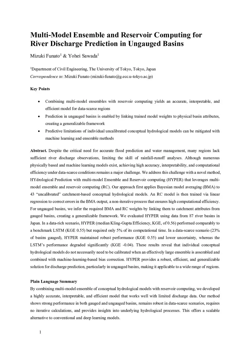 Despite the necessity for accurate flood prediction, many regions lack sufficient river discharge observations. Although numerous models for daily river discharge prediction exist, achieving high accuracy, interpretability, and efficiency under data-scarce conditions remains a major challenge. We address this with a novel method, HYdrological Prediction with multi-model Ensemble and Reservoir computing (HYPER). Our approach applies Bayesian model averaging (BMA) to 47 "uncalibrated" catchment-based conceptual hydrological models. A reservoir computing (RC) model, a type of machine learning model, is then trained via linear regression to correct BMA output errors, a non-iterative process ensuring computational efficiency. For ungauged basins, we infer the required BMA and RC weights by mapping them to catchment attributes from gauged basins, creating a generalizable framework. Evaluated on 87 Japanese basins, in a data-rich scenario, HYPER (median Nash Sutcliffe Efficiency, NSE, of 0.59) performed comparably to a benchmark LSTM (NSE 0.64) but required only 3 % of its computational time. In a data-scarce scenario (where only ~20 % of basins are gauged), HYPER maintained robust performance (NSE 0.51) by leveraging the physical structure of the ensemble. In contrast, the LSTM's performance degraded substantially (NSE -0.61) due to data insufficiency. These results demonstrate that calibrating individual conceptual hydrological models is unnecessary when using a sufficiently large ensemble that is assembled and combined with machine-learning-based bias correction. HYPER provides a robust, efficient, and generalizable solution for discharge prediction, particularly in ungauged basins. By eliminating basin-specific calibration, HYPER offers a scalable, interpretable framework for accurate hydrological prediction in diverse data-scarce regions.