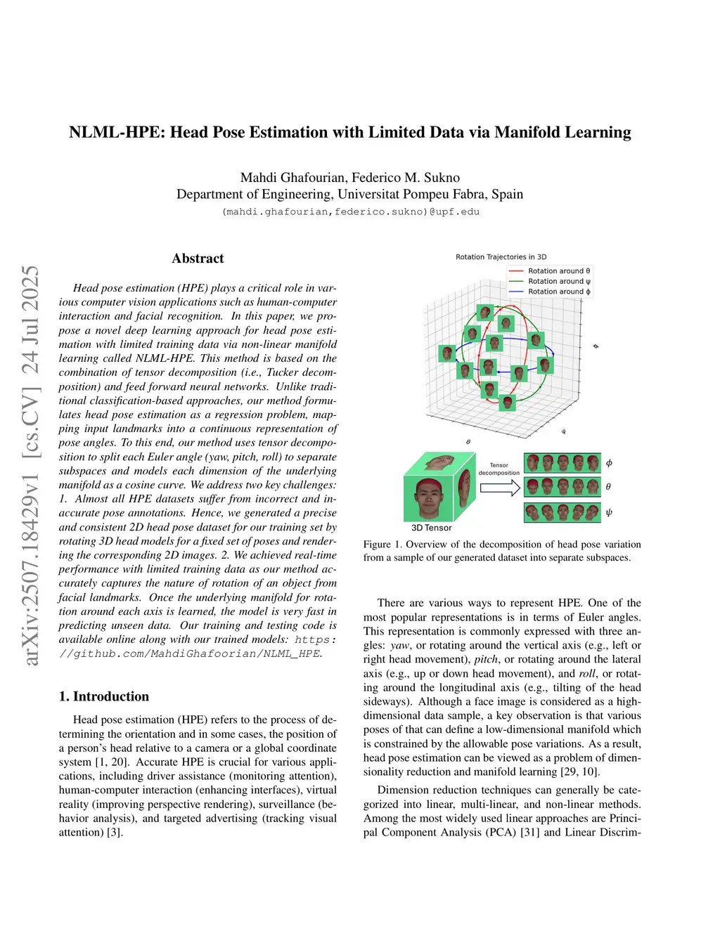 Head pose estimation (HPE) plays a critical role in various computer vision applications such as human-computer interaction and facial recognition. In this paper, we propose a novel deep learning approach for head pose estimation with limited training data via non-linear manifold learning called NLML-HPE. This method is based on the combination of tensor decomposition (i.e., Tucker decomposition) and feed forward neural networks. Unlike traditional classification-based approaches, our method formulates head pose estimation as a regression problem, mapping input landmarks into a continuous representation of pose angles. To this end, our method uses tensor decomposition to split each Euler angle (yaw, pitch, roll) to separate subspaces and models each dimension of the underlying manifold as a cosine curve. We address two key challenges: 1. Almost all HPE datasets suffer from incorrect and inaccurate pose annotations. Hence, we generated a precise and consistent 2D head pose dataset for our training set by rotating 3D head models for a fixed set of poses and rendering the corresponding 2D images. 2. We achieved real-time performance with limited training data as our method accurately captures the nature of rotation of an object from facial landmarks. Once the underlying manifold for rotation around each axis is learned, the model is very fast in predicting unseen data. Our training and testing code is available online along with our trained models: https: //github.com/MahdiGhafoorian/NLML_HPE.