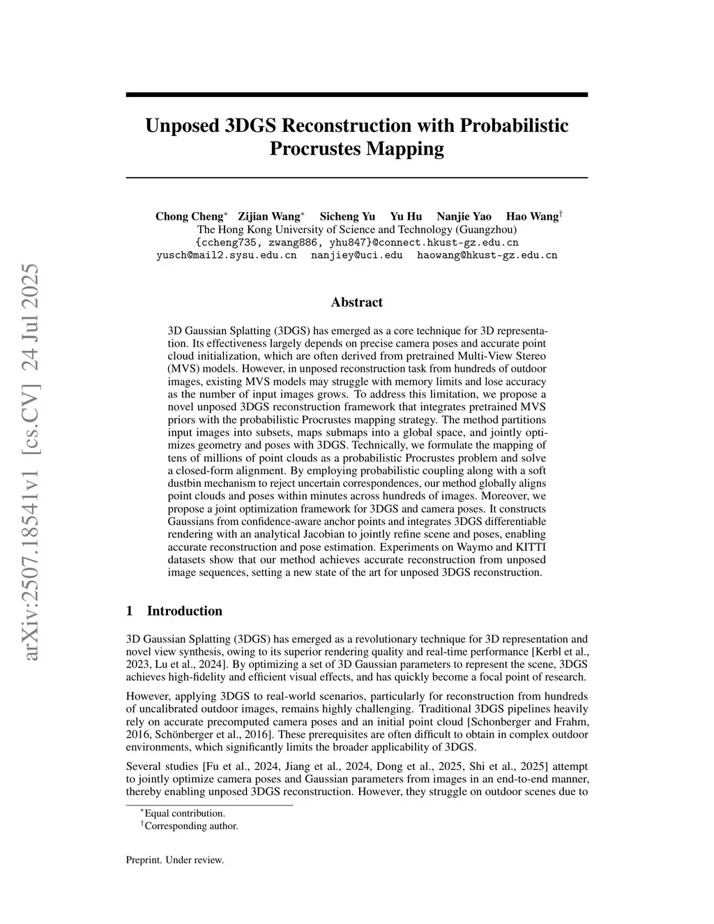 3D Gaussian Splatting (3DGS) has emerged as a core technique for 3D representation. Its effectiveness largely depends on precise camera poses and accurate point cloud initialization, which are often derived from pretrained Multi-View Stereo (MVS) models. However, in unposed reconstruction task from hundreds of outdoor images, existing MVS models may struggle with memory limits and lose accuracy as the number of input images grows. To address this limitation, we propose a novel unposed 3DGS reconstruction framework that integrates pretrained MVS priors with the probabilistic Procrustes mapping strategy. The method partitions input images into subsets, maps submaps into a global space, and jointly optimizes geometry and poses with 3DGS. Technically, we formulate the mapping of tens of millions of point clouds as a probabilistic Procrustes problem and solve a closed-form alignment. By employing probabilistic coupling along with a soft dustbin mechanism to reject uncertain correspondences, our method globally aligns point clouds and poses within minutes across hundreds of images. Moreover, we propose a joint optimization framework for 3DGS and camera poses. It constructs Gaussians from confidence-aware anchor points and integrates 3DGS differentiable rendering with an analytical Jacobian to jointly refine scene and poses, enabling accurate reconstruction and pose estimation. Experiments on Waymo and KITTI datasets show that our method achieves accurate reconstruction from unposed image sequences, setting a new state of the art for unposed 3DGS reconstruction.