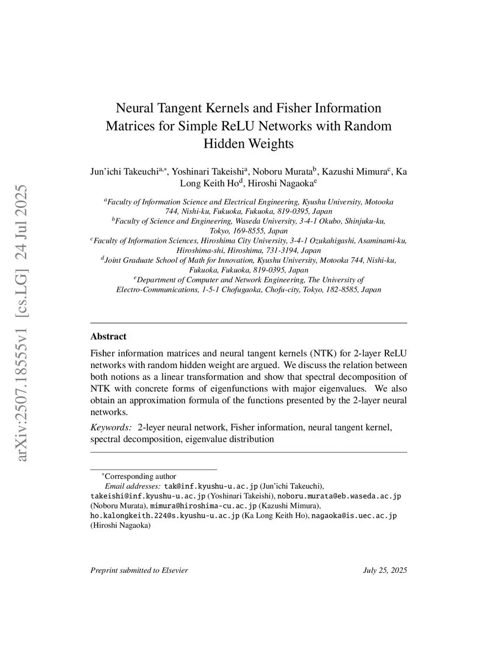 Neural Tangent Kernels and Fisher Information Matrices for Simple ReLU Networks with Random Hidden Weights