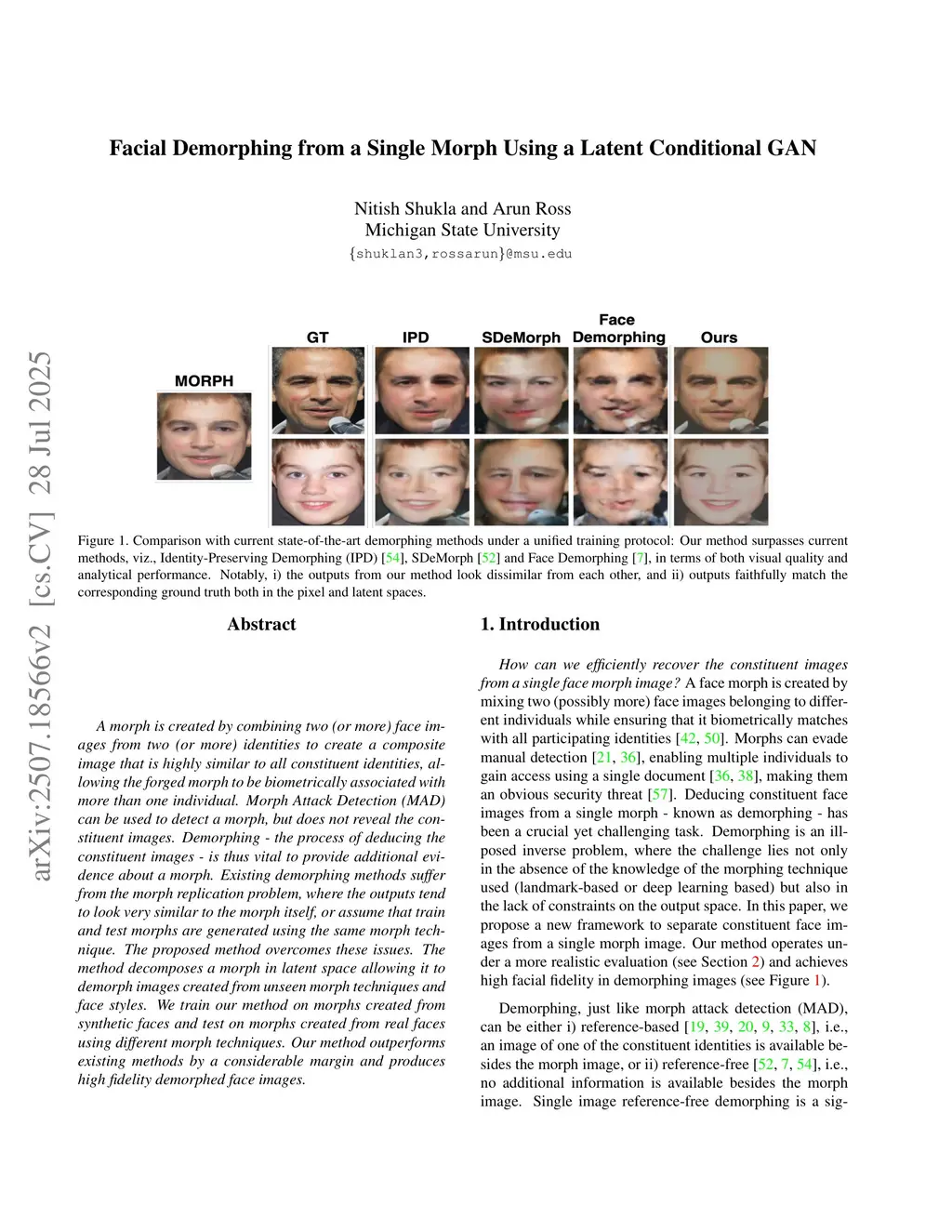 Facial Demorphing from a Single Morph Using a Latent Conditional GAN