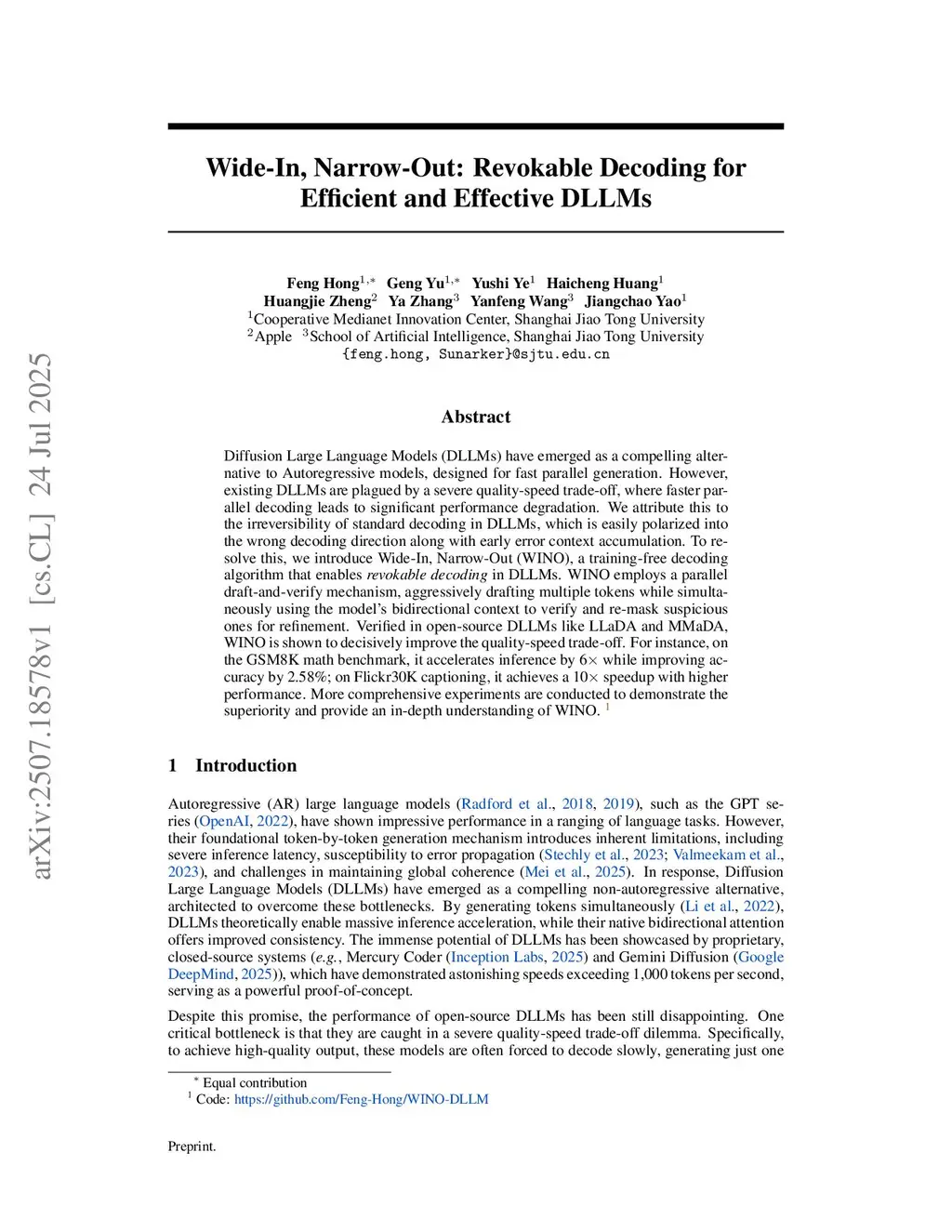 Diffusion Large Language Models (DLLMs) have emerged as a compelling alternative to Autoregressive models, designed for fast parallel generation. However, existing DLLMs are plagued by a severe quality-speed trade-off, where faster parallel decoding leads to significant performance degradation. We attribute this to the irreversibility of standard decoding in DLLMs, which is easily polarized into the wrong decoding direction along with early error context accumulation. To resolve this, we introduce Wide-In, Narrow-Out (WINO), a training-free decoding algorithm that enables revokable decoding in DLLMs. WINO employs a parallel draft-and-verify mechanism, aggressively drafting multiple tokens while simultaneously using the model's bidirectional context to verify and re-mask suspicious ones for refinement. Verified in open-source DLLMs like LLaDA and MMaDA, WINO is shown to decisively improve the quality-speed trade-off. For instance, on the GSM8K math benchmark, it accelerates inference by 6 while improving accuracy by 2.58%; on Flickr30K captioning, it achieves a 10 speedup with higher performance. More comprehensive experiments are conducted to demonstrate the superiority and provide an in-depth understanding of WINO.