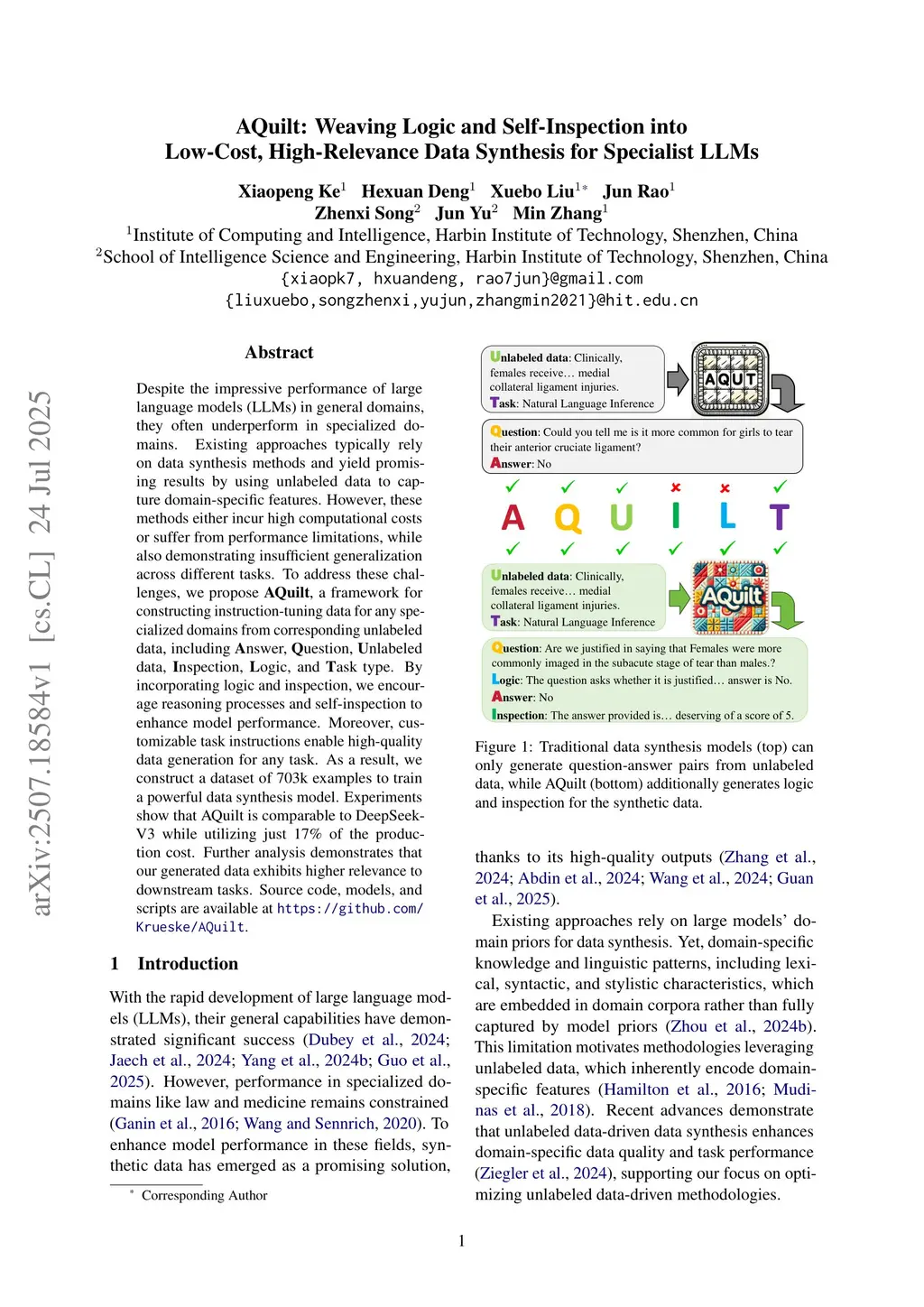 Despite the impressive performance of large language models (LLMs) in general domains, they often underperform in specialized domains. Existing approaches typically rely on data synthesis methods and yield promising results by using unlabeled data to capture domain-specific features. However, these methods either incur high computational costs or suffer from performance limitations, while also demonstrating insufficient generalization across different tasks. To address these challenges, we propose AQuilt, a framework for constructing instruction-tuning data for any specialized domains from corresponding unlabeled data, including Answer, Question, Unlabeled data, Inspection, Logic, and Task type. By incorporating logic and inspection, we encourage reasoning processes and self-inspection to enhance model performance. Moreover, customizable task instructions enable high-quality data generation for any task. As a result, we construct a dataset of 703k examples to train a powerful data synthesis model. Experiments show that AQuilt is comparable to DeepSeek-V3 while utilizing just 17% of the production cost. Further analysis demonstrates that our generated data exhibits higher relevance to downstream tasks. Source code, models, and scripts are available atthis https URL.