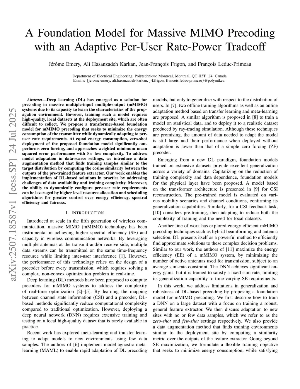 Deep learning (DL) has emerged as a solution for precoding in massive multiple-input multiple-output (mMIMO) systems due to its capacity to learn the characteristics of the propagation environment. However, training such a model requires high-quality, local datasets at the deployment site, which are often difficult to collect. We propose a transformer-based foundation model for mMIMO precoding that seeks to minimize the energy consumption of the transmitter while dynamically adapting to per-user rate requirements. At equal energy consumption, zero-shot deployment of the proposed foundation model significantly outperforms zero forcing, and approaches weighted minimum mean squared error performance with 8x less complexity. To address model adaptation in data-scarce settings, we introduce a data augmentation method that finds training samples similar to the target distribution by computing the cosine similarity between the outputs of the pre-trained feature extractor. Our work enables the implementation of DL-based solutions in practice by addressing challenges of data availability and training complexity. Moreover, the ability to dynamically configure per-user rate requirements can be leveraged by higher level resource allocation and scheduling algorithms for greater control over energy efficiency, spectral efficiency and fairness.