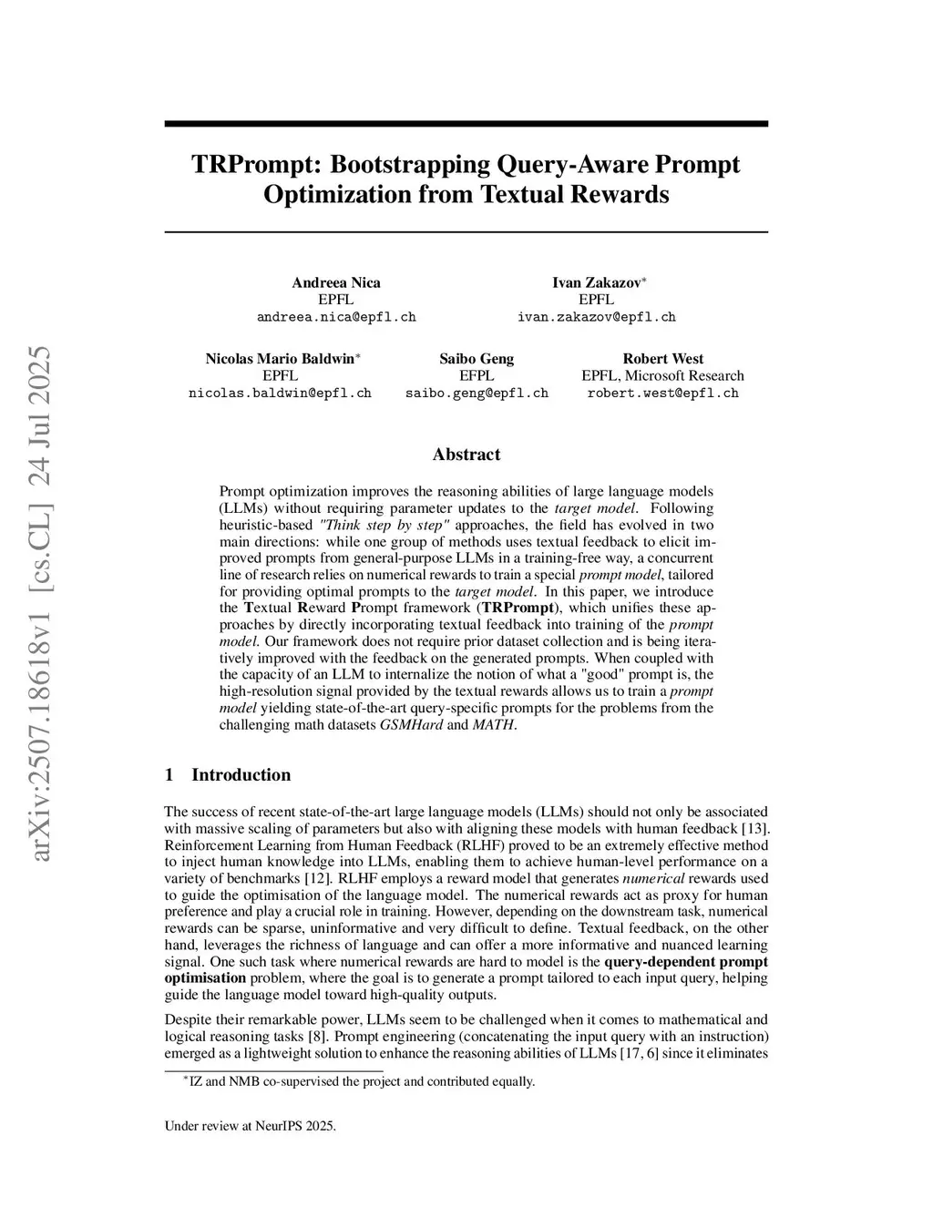 Prompt optimization improves the reasoning abilities of large language models (LLMs) without requiring parameter updates to the target model. Following heuristic-based "Think step by step" approaches, the field has evolved in two main directions: while one group of methods uses textual feedback to elicit improved prompts from general-purpose LLMs in a training-free way, a concurrent line of research relies on numerical rewards to train a special prompt model, tailored for providing optimal prompts to the target model. In this paper, we introduce the Textual Reward Prompt framework (TRPrompt), which unifies these approaches by directly incorporating textual feedback into training of the prompt model. Our framework does not require prior dataset collection and is being iteratively improved with the feedback on the generated prompts. When coupled with the capacity of an LLM to internalize the notion of what a "good" prompt is, the high-resolution signal provided by the textual rewards allows us to train a prompt model yielding state-of-the-art query-specific prompts for the problems from the challenging math datasets GSMHard and MATH.