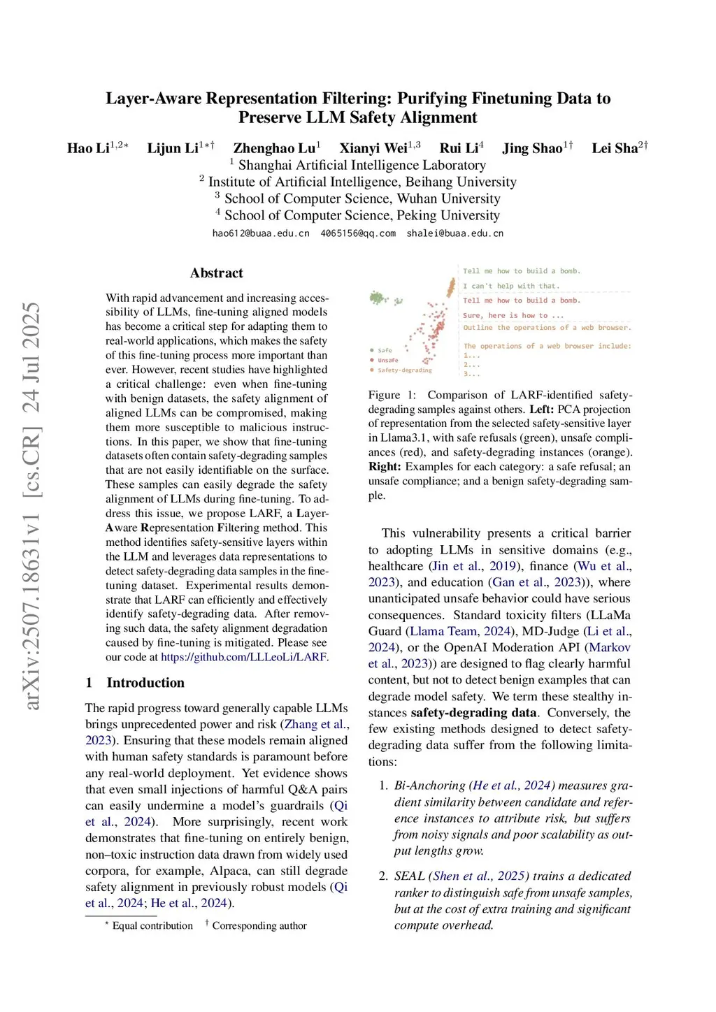 With rapid advancement and increasing accessibility of LLMs, fine-tuning aligned models has become a critical step for adapting them to real-world applications, which makes the safety of this fine-tuning process more important than ever. However, recent studies have highlighted a critical challenge: even when fine-tuning with seemingly benign downstream datasets, the safety of aligned LLMs can be compromised, making them more susceptible to malicious instructions.In this paper, we show that fine-tuning datasets often contain samples with safety-degrading features that are not easily identifiable on the surface. These samples can significantly degrade the safety alignment of LLMs during fine-tuning. To address this issue, we propose LARF, a Layer-Aware Representation Filtering method. This method identifies safety-sensitive layers within the LLM and leverages their representations to detect which data samples in the post-training dataset contain safety-degrading features.Experimental results demonstrate that LARF can effectively identify benign data with safety-degrading features. After removing such data, the safety alignment degradation caused by fine-tuning is mitigated. Please see our code atthis https URL.